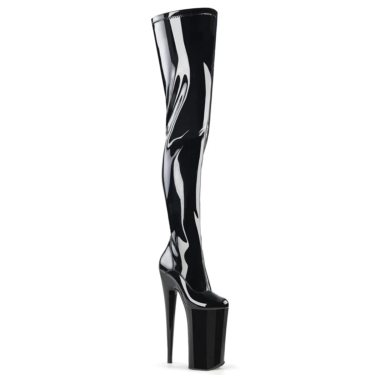 Diseño atrevido con efecto ‘pierna infinita’ instantáneo. Bota con plataforma extra alta: presencia máxima y look ‘statement’. Detalles clave: plataforma extra alta, acabado en pat, suela de goma, color negro stretch charol / negro, estilo vegano. Altura aprox.: tacón 26 cm + plataforma 16 cm. Un acierto para quien quiere destacar de verdad.