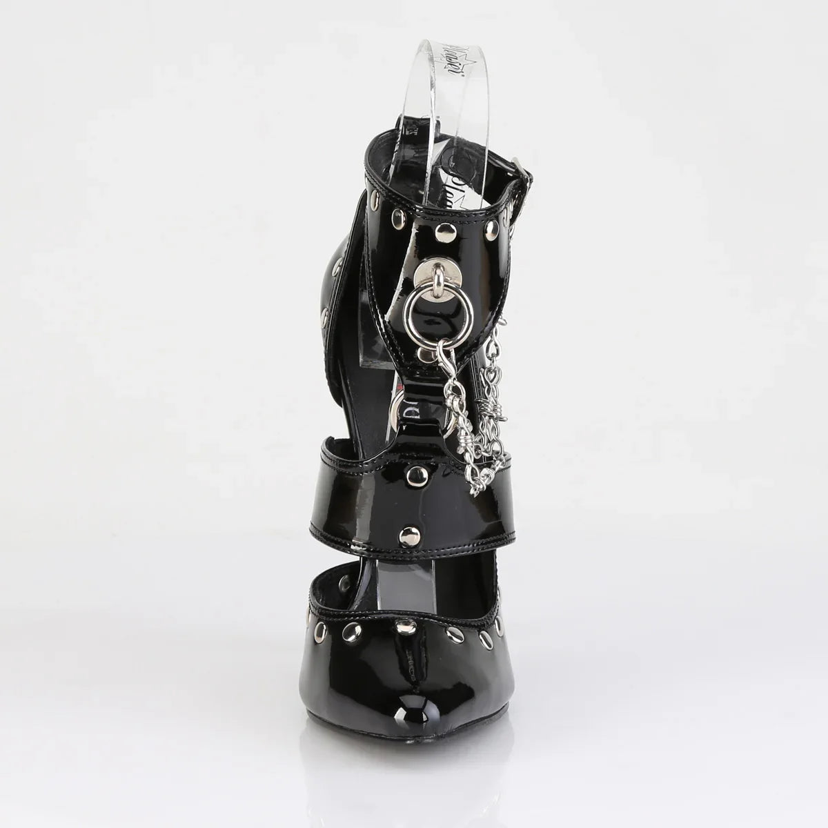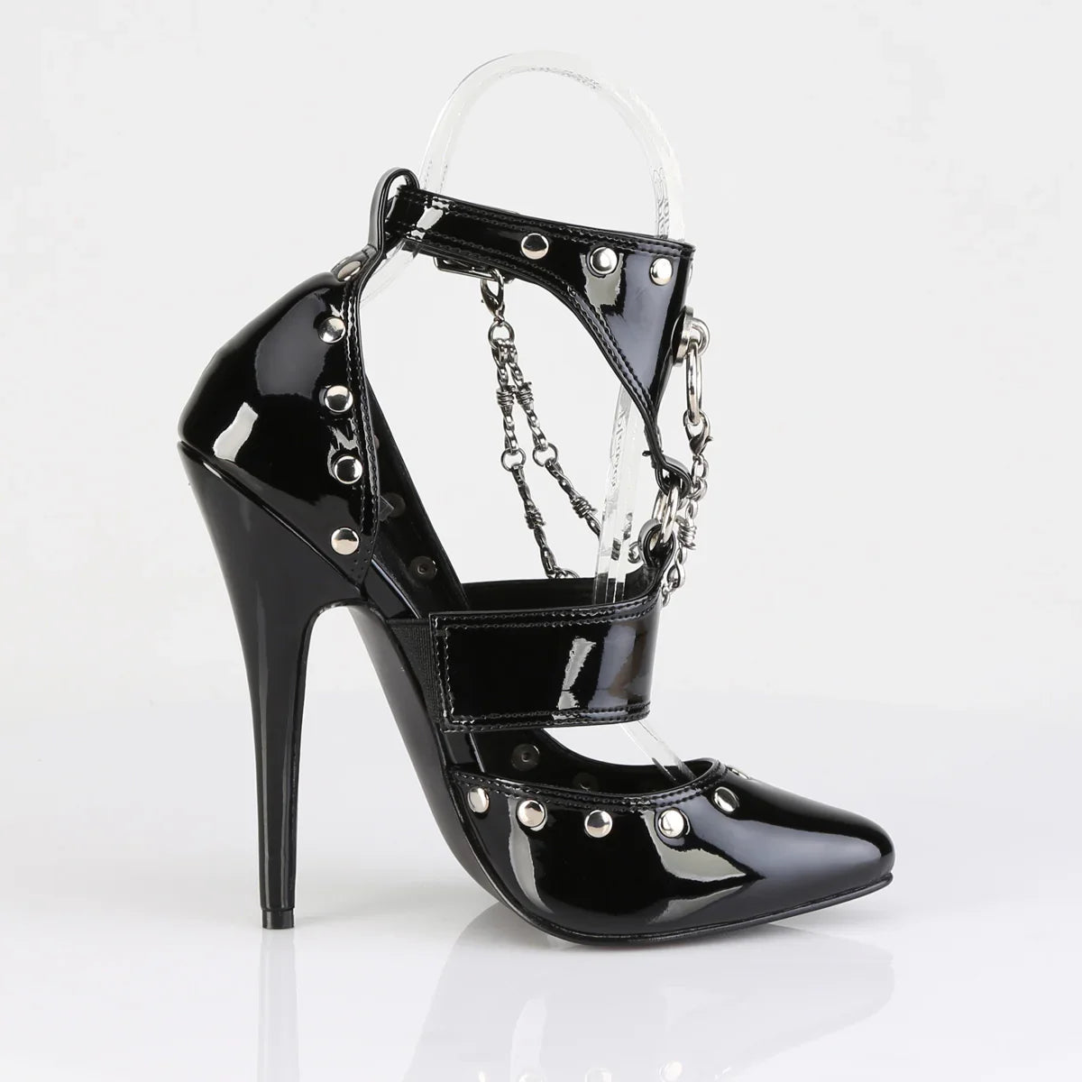 Un modelo muy visual para looks de impacto. Diseño cómodo y muy visual para evento, sesión y looks de diario con estilo. Detalles clave: acabado en pat, suela de goma, color negro charol, estilo vegano. Altura aprox. del tacón: 15 cm. Impacto visual asegurado.