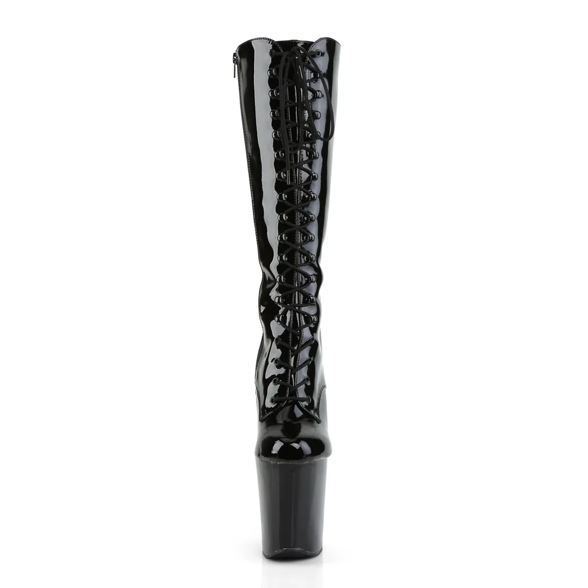 Impacto total: altura, presencia y estilo. Bota con plataforma muy alta: presencia brutal y look ‘statement’. Detalles clave: plataforma muy alta, acabado en pat, suela de goma, color negro charol / negro, estilo vegano. Altura aprox.: tacón 20 cm + plataforma 10 cm. Para un look atrevido y muy visual.