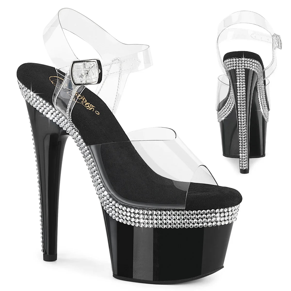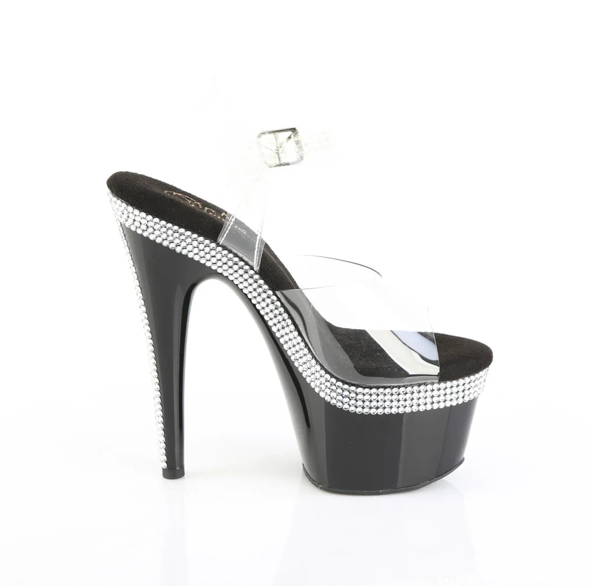 Ligera, elegante y con un look que no pasa desapercibido. La plataforma ayuda a repartir la inclinación del pie y mejora la estabilidad al caminar. Detalles que marcan la diferencia: acabado en pvc, suela de goma, color transparente / negro. Altura total aprox. 18 cm con plataforma: impacto visual máximo, sin perder control.