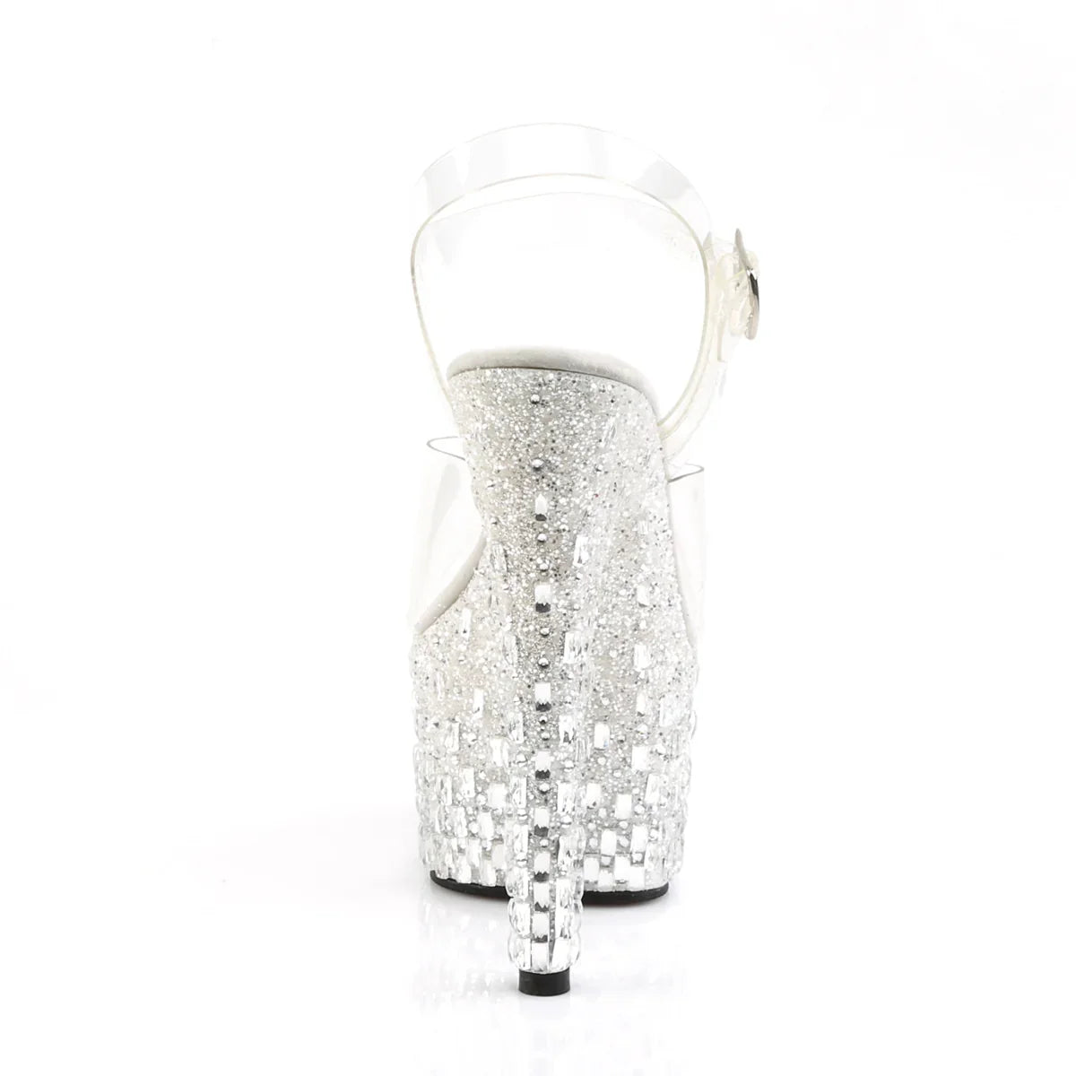 Ligera, elegante y con un look que no pasa desapercibido. La plataforma ayuda a repartir la inclinación del pie y mejora la estabilidad al caminar. Detalles que marcan la diferencia: acabado en pvc, suela de goma, color transparente / blanco - plata. Altura total aprox. 18 cm con plataforma: impacto visual máximo, sin perder control.