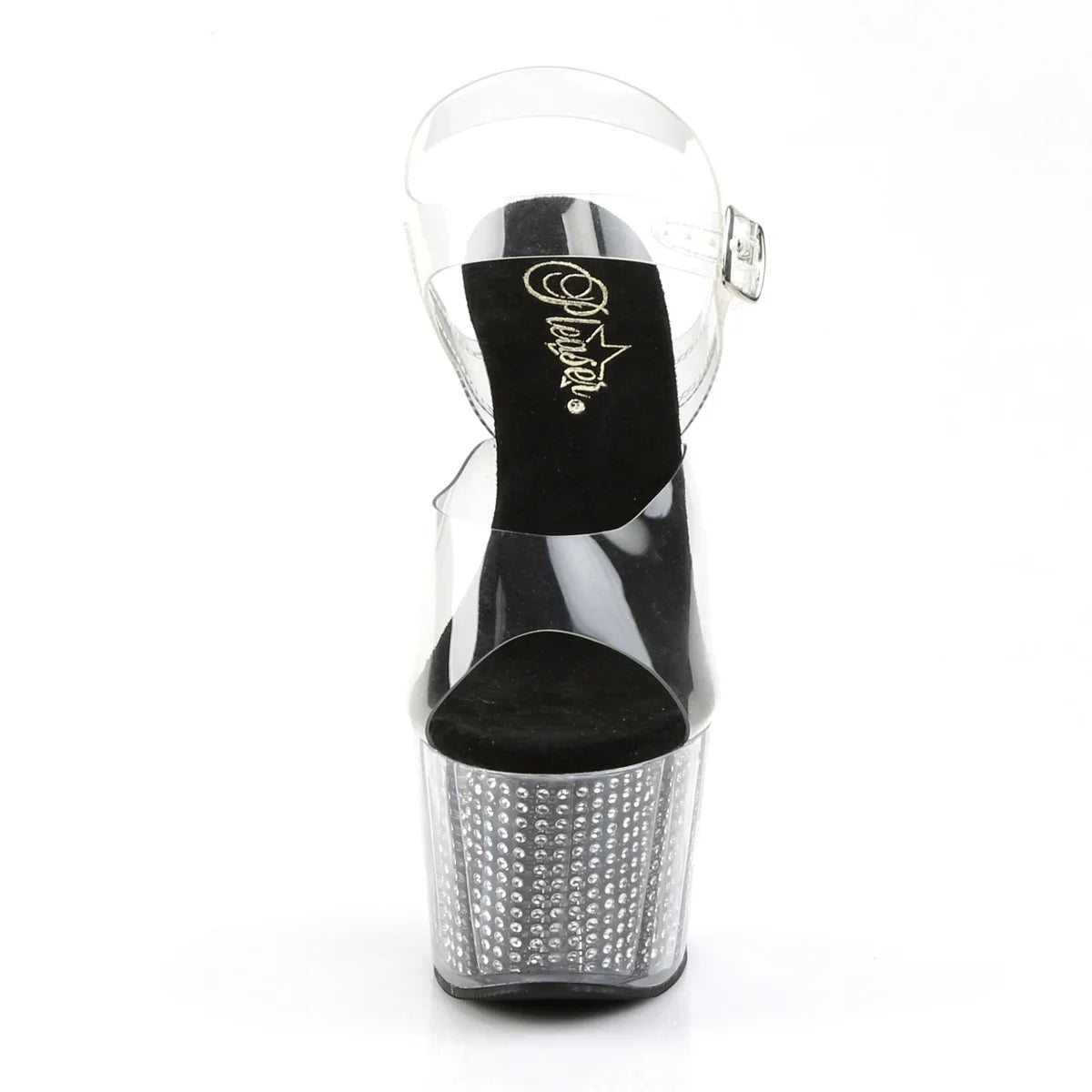 Ligera, elegante y con un look que no pasa desapercibido. La plataforma ayuda a repartir la inclinación del pie y mejora la estabilidad al caminar. Detalles que marcan la diferencia: acabado en pvc, suela de goma, color transparente / negro srs. Altura total aprox. 18 cm con plataforma: impacto visual máximo, sin perder control.