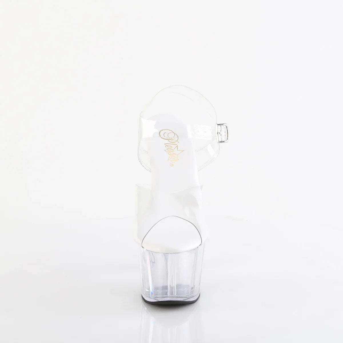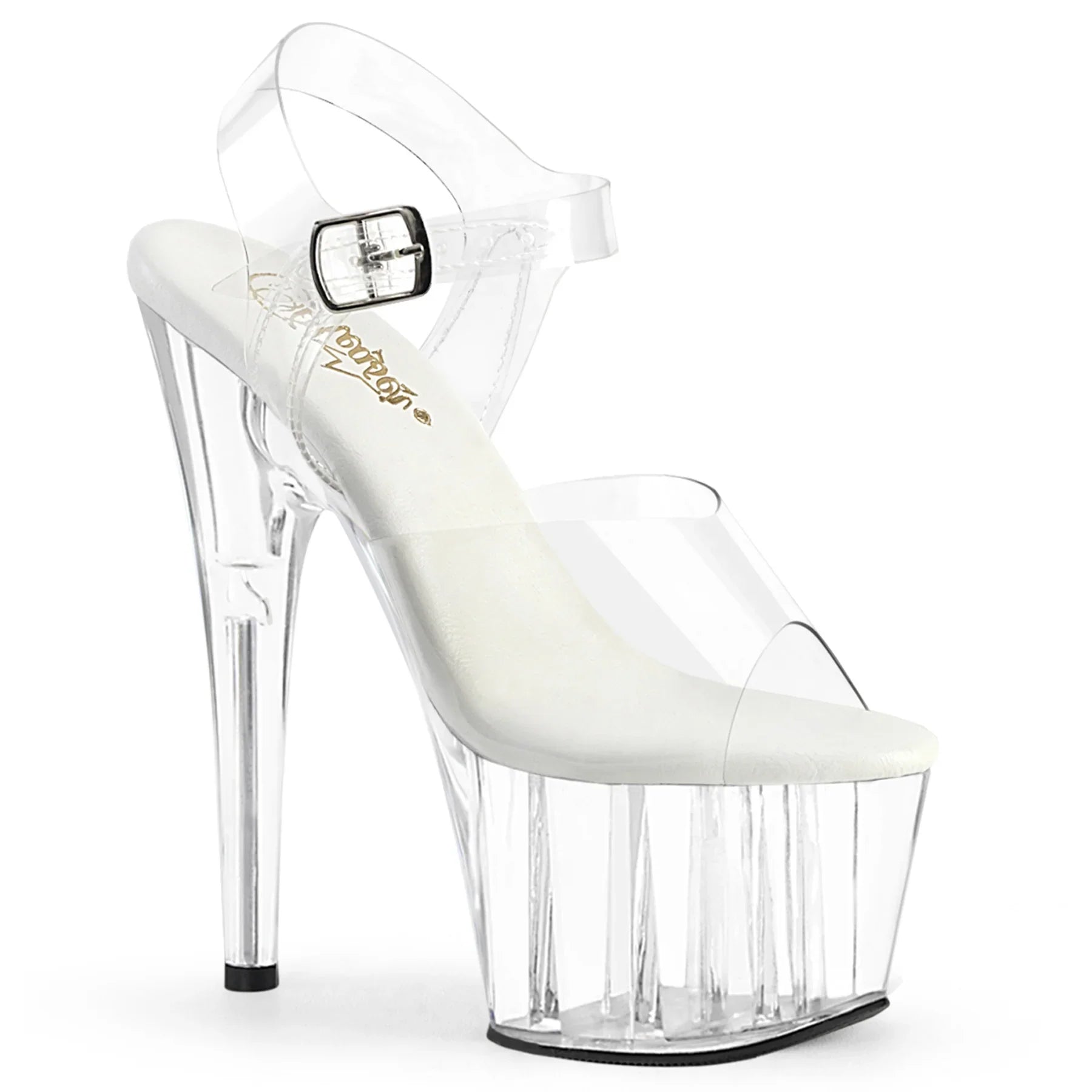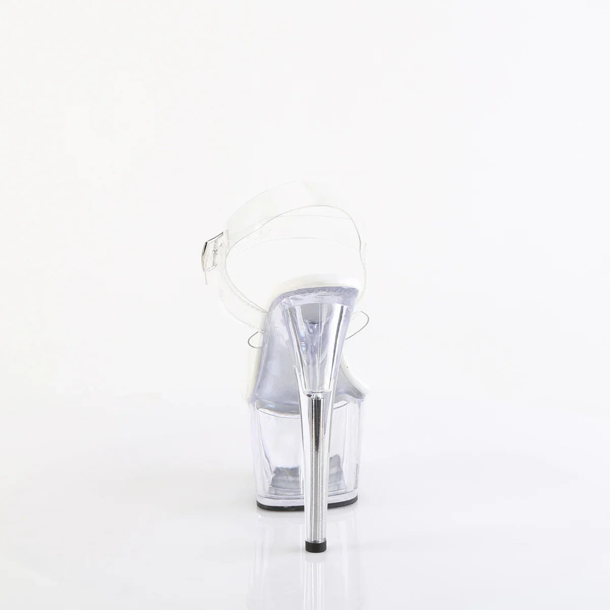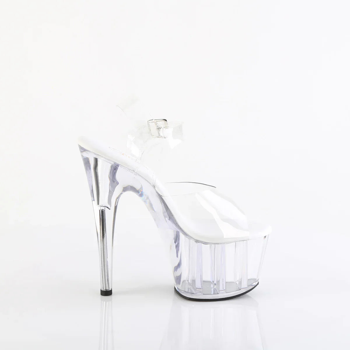 Ligera, elegante y con un look que no pasa desapercibido. La plataforma ayuda a repartir la inclinación del pie y mejora la estabilidad al caminar. Detalles que marcan la diferencia: acabado en pvc, suela de goma, color transparente / transparente. Altura total aprox. 18 cm con plataforma: impacto visual máximo, sin perder control.
