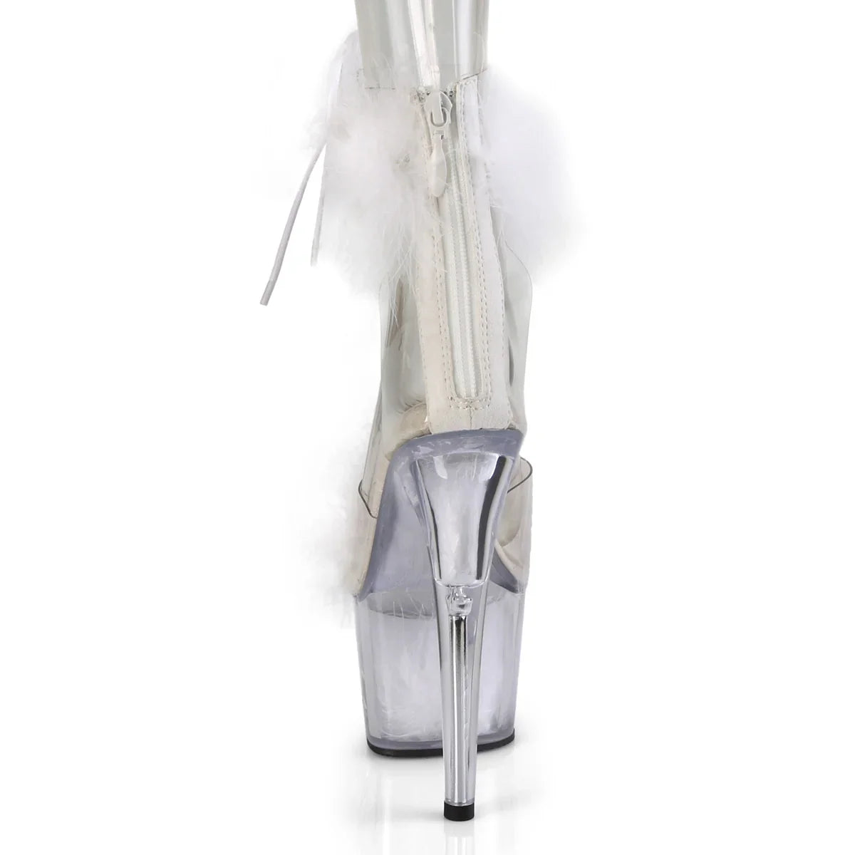 Ligera, elegante y con un look que no pasa desapercibido. La plataforma ayuda a repartir la inclinación del pie y mejora la estabilidad al caminar. Detalles que marcan la diferencia: acabado en pvc, suela de goma, color transparente - blanco fur / blanco fur. Altura total aprox. 18 cm con plataforma: impacto visual máximo, sin perder control.