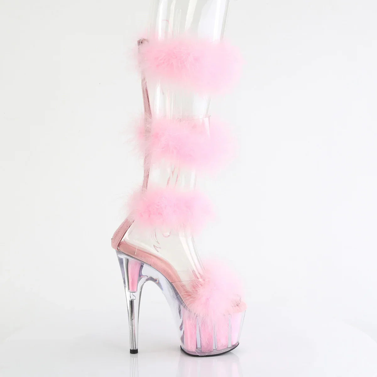 Ligera, elegante y con un look que no pasa desapercibido. La plataforma ayuda a repartir la inclinación del pie y mejora la estabilidad al caminar. Detalles que marcan la diferencia: acabado en pvc, suela de goma, color transparente - b. rosa fur / m. Altura total aprox. 18 cm con plataforma: impacto visual máximo, sin perder control.
