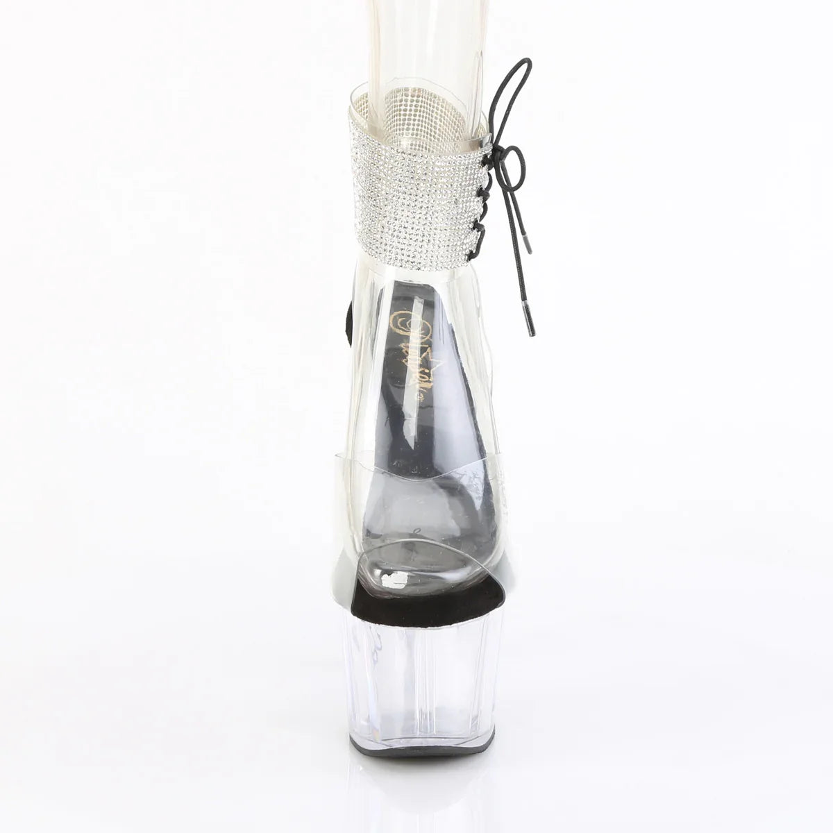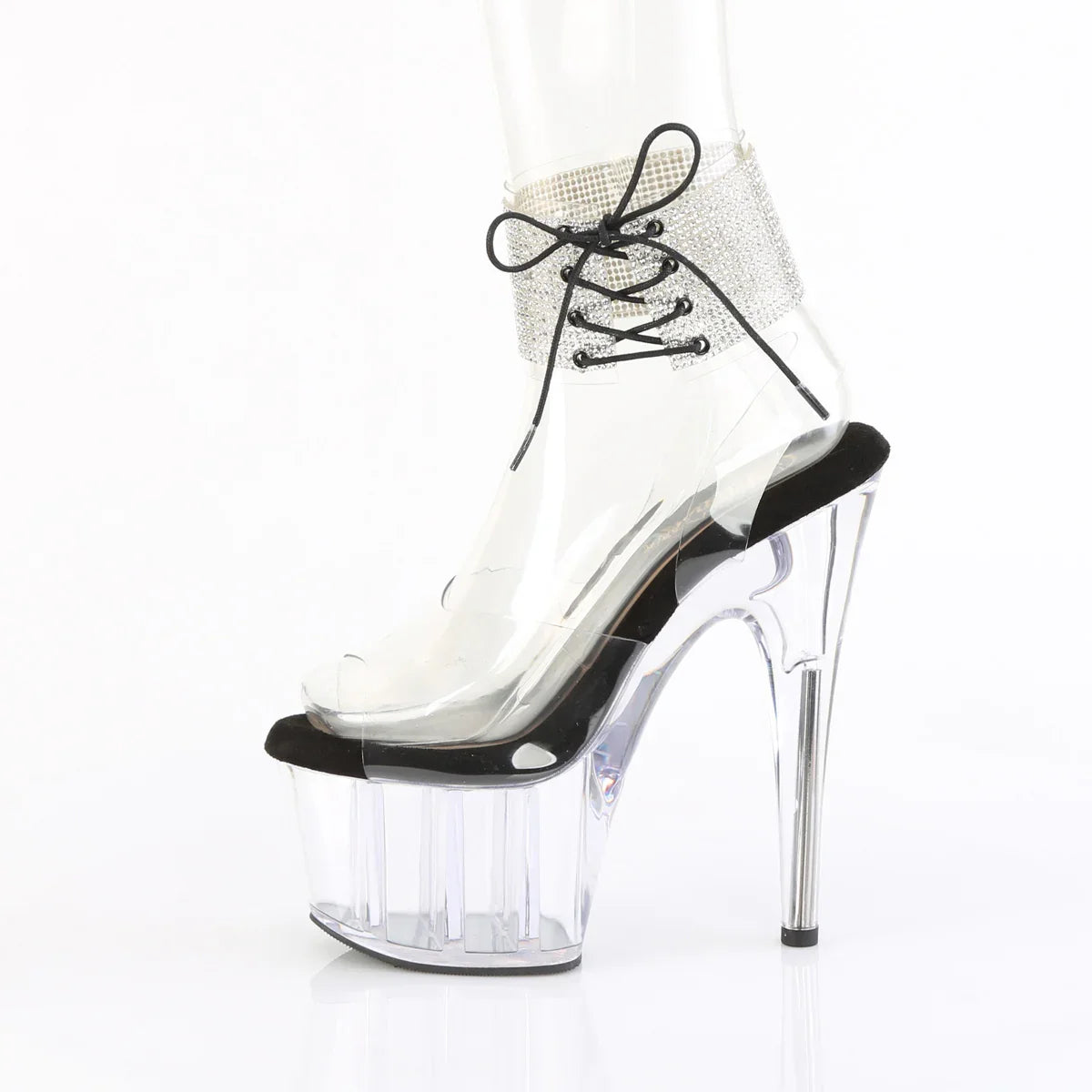 Ligera, elegante y con un look que no pasa desapercibido. La plataforma ayuda a repartir la inclinación del pie y mejora la estabilidad al caminar. Detalles que marcan la diferencia: acabado en pvc, suela de goma, color transparente - negro / transparente. Altura total aprox. 18 cm con plataforma: impacto visual máximo, sin perder control.