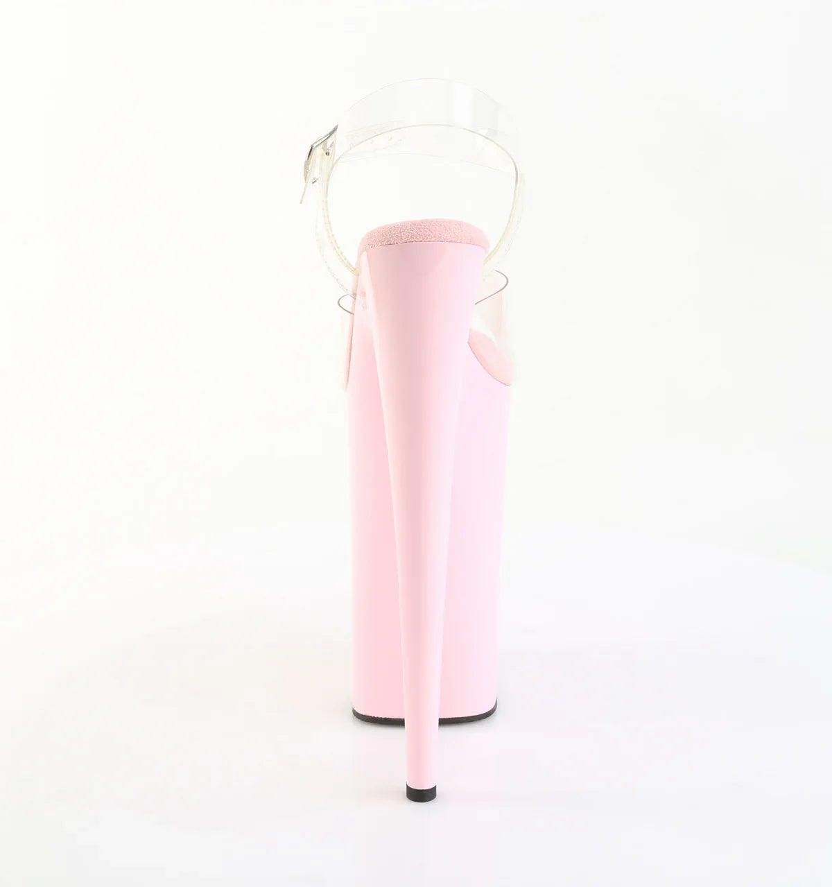 Diseño atrevido con efecto ‘pierna infinita’ instantáneo. Plataforma muy elevada para una estética espectacular y llamativa. Detalles clave: plataforma extra alta, acabado en pvc, suela de goma, color transparente / b. rosa, estilo vegano. Altura aprox.: tacón 26 cm + plataforma 16 cm. Altura y presencia, sin compromisos.