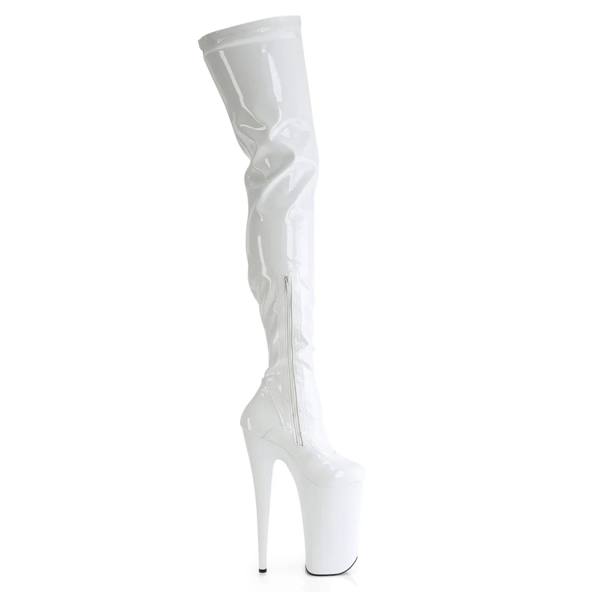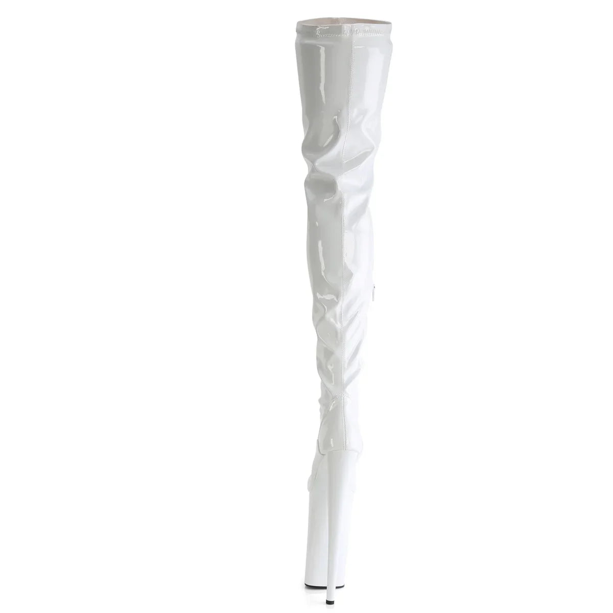 Un statement total: altura, estética y actitud. Bota con plataforma extra alta: presencia máxima y look ‘statement’. Detalles clave: plataforma extra alta, acabado en pat, suela de goma, color blanco str charol / blanco, estilo vegano. Altura aprox.: tacón 26 cm + plataforma 16 cm. Un acierto para quien quiere destacar de verdad.