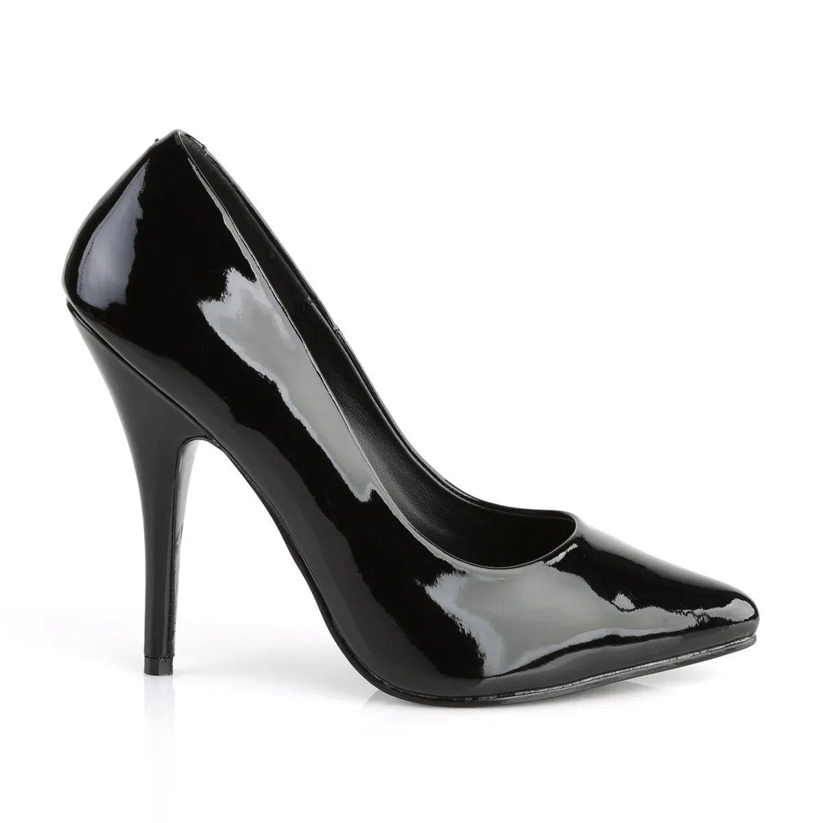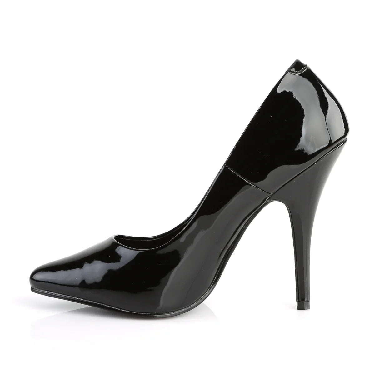 Una silueta que alarga la pierna y realza la postura. Zapato de tacón elegante: limpio, estilizado y muy favorecedor. Detalles clave: acabado en pat, suela de goma, color negro charol, estilo vegano. Altura aprox. del tacón: 13 cm. Un básico de armario con el sello Pleaser.