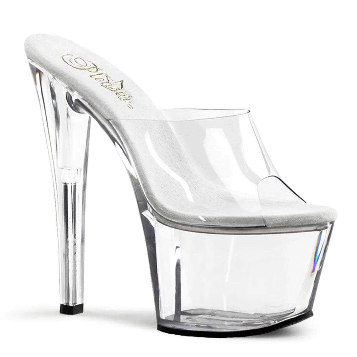 Ligera, elegante y con un look que no pasa desapercibido. La plataforma ayuda a repartir la inclinación del pie y mejora la estabilidad al caminar. Detalles que marcan la diferencia: acabado en pvc, suela de goma, color transparente / transparente. Altura total aprox. 18 cm con plataforma: impacto visual máximo, sin perder control.