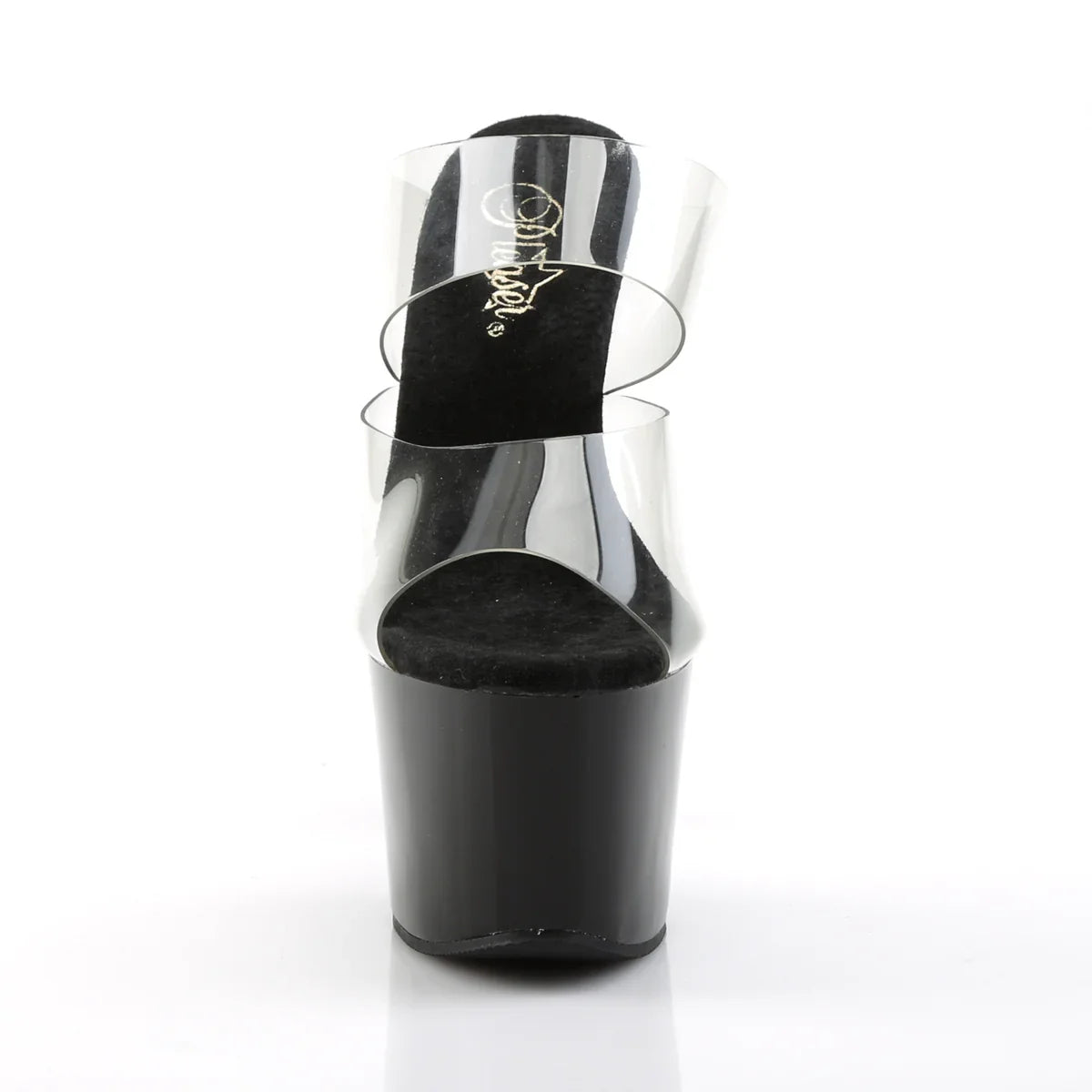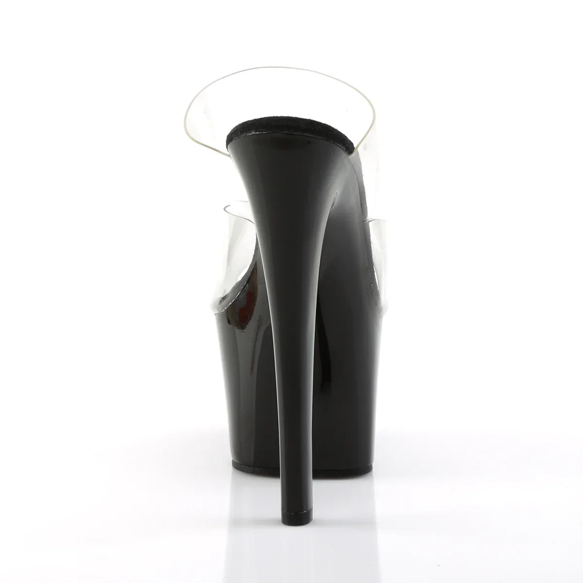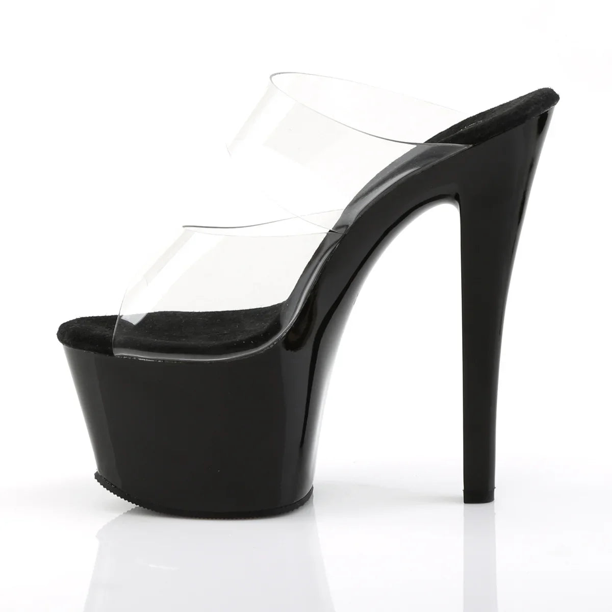 Ligera, elegante y con un look que no pasa desapercibido. La plataforma ayuda a repartir la inclinación del pie y mejora la estabilidad al caminar. Detalles que marcan la diferencia: acabado en pvc, suela de goma, color transparente / negro. Altura total aprox. 18 cm con plataforma: impacto visual máximo, sin perder control.