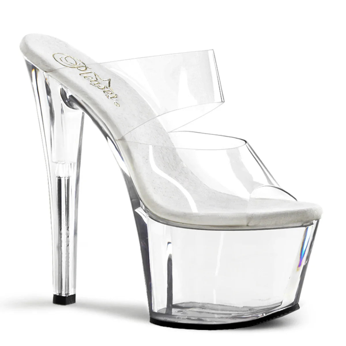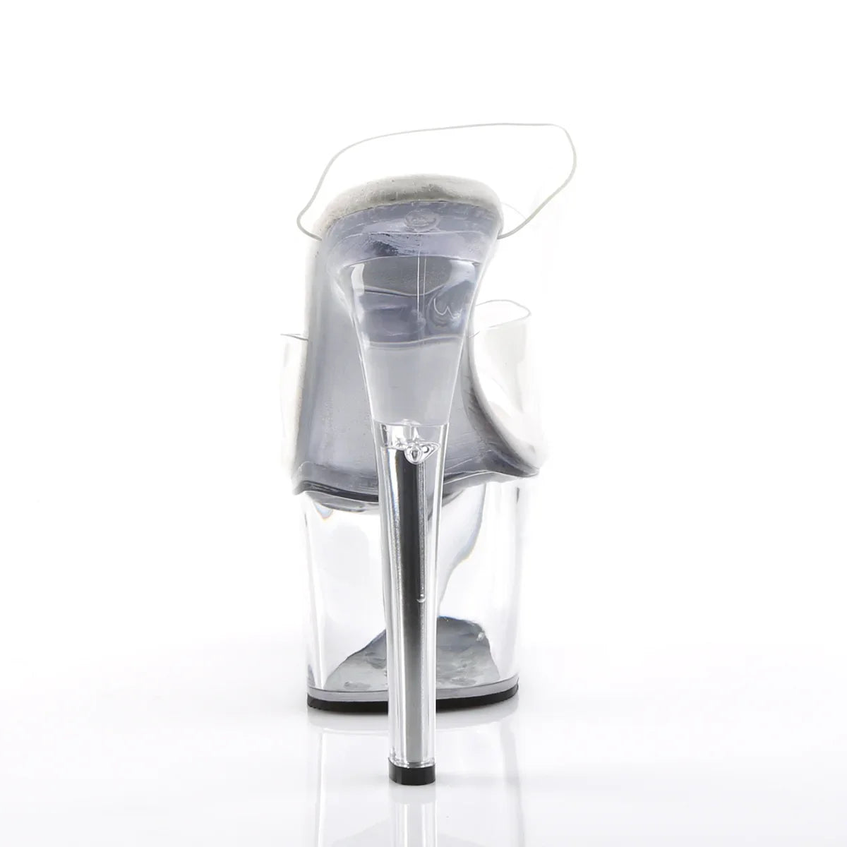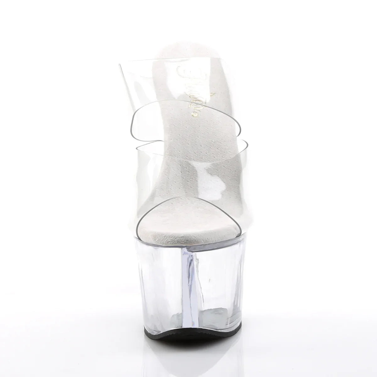 Ligera, elegante y con un look que no pasa desapercibido. La plataforma ayuda a repartir la inclinación del pie y mejora la estabilidad al caminar. Detalles que marcan la diferencia: acabado en pvc, suela de goma, color transparente / transparente. Altura total aprox. 18 cm con plataforma: impacto visual máximo, sin perder control.