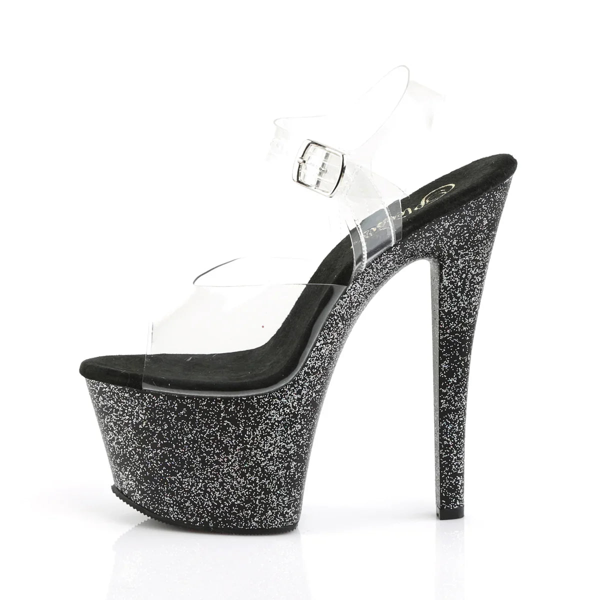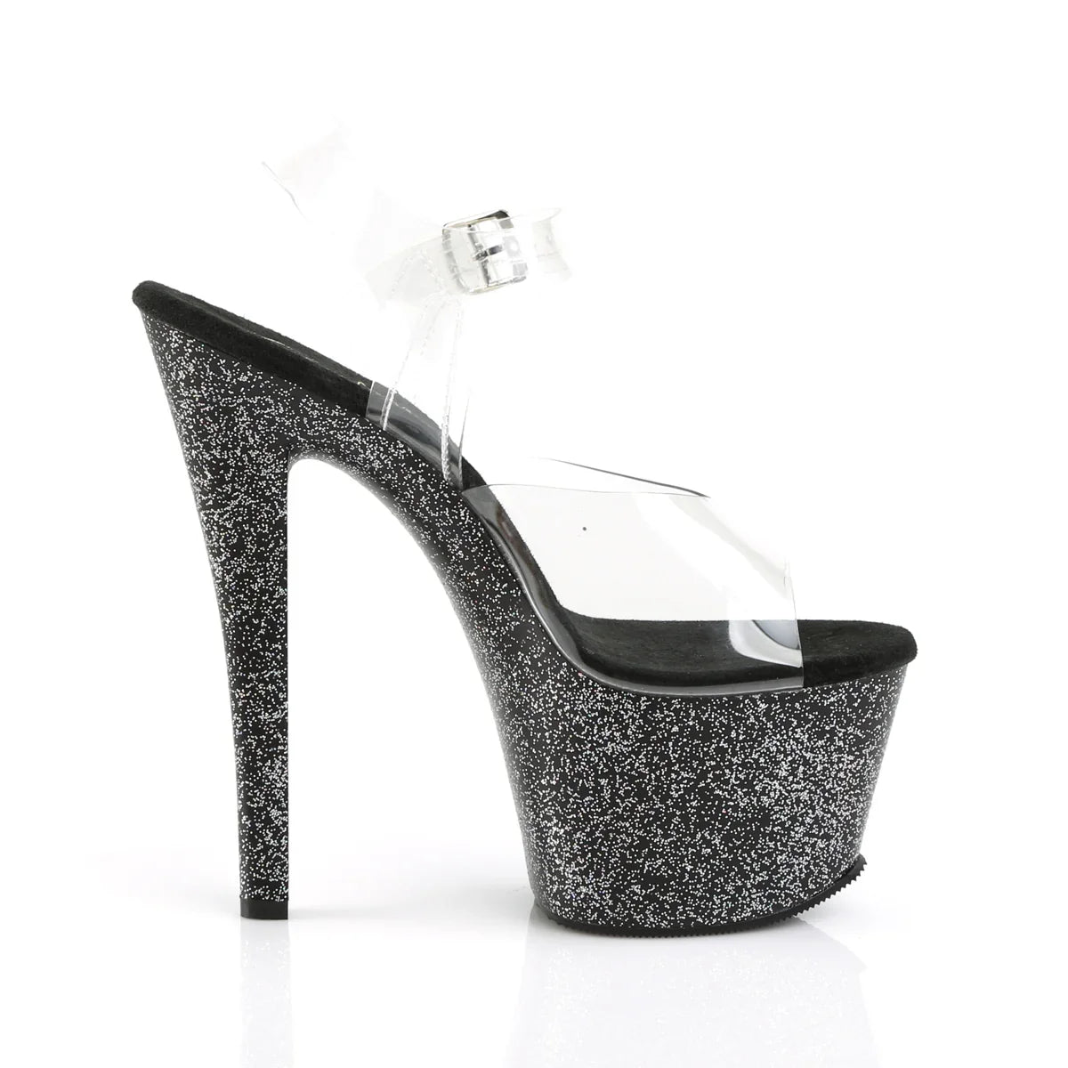 Ligera, elegante y con un look que no pasa desapercibido. La plataforma ayuda a repartir la inclinación del pie y mejora la estabilidad al caminar. Detalles que marcan la diferencia: acabado en pvc, suela de goma, color transparente / negro. Altura total aprox. 18 cm con plataforma: impacto visual máximo, sin perder control.