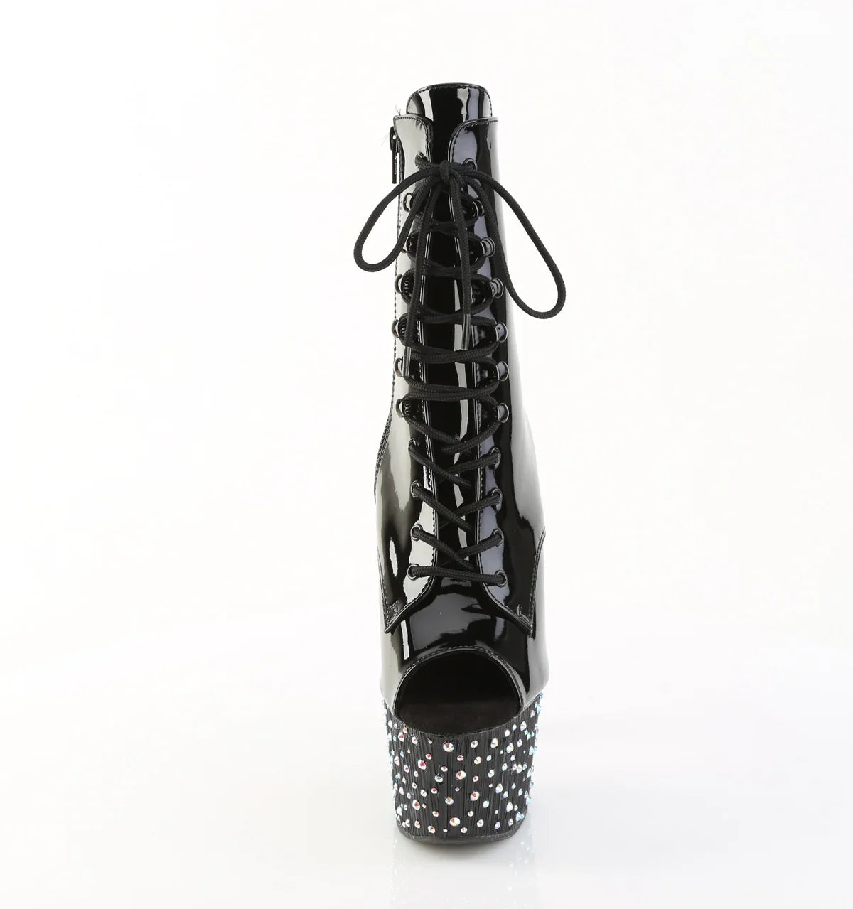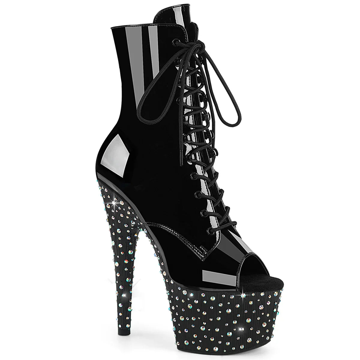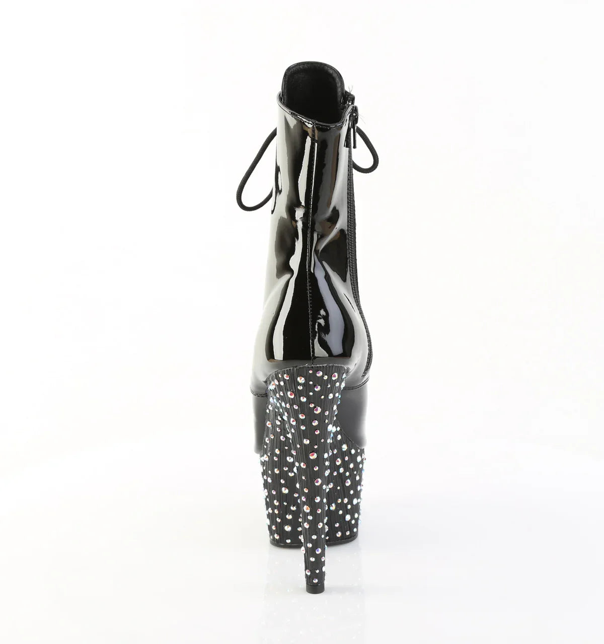 Diseño potente y estilizado para un look con presencia. Una bota estilizada que suma actitud sin perder elegancia. Detalles clave: plataforma para mejorar la estabilidad, acabado en pat, suela de goma, color negro charol / negro - plata multicolor rs, estilo vegano. Altura aprox.: tacón 18 cm + plataforma 7 cm. Un acierto para evento, show o sesiones de fotos.