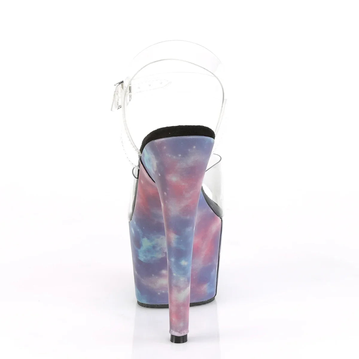 Lightweight, elegant, and with a look that won't go unnoticed. The platform helps distribute the foot's tilt and improves stability while walking. Details that make all the difference: PVC finish, rubber sole, transparent/purple-blue reflective color. Total height approx. 18 cm with platform: maximum visual impact without sacrificing control.