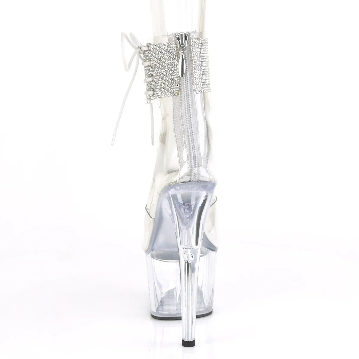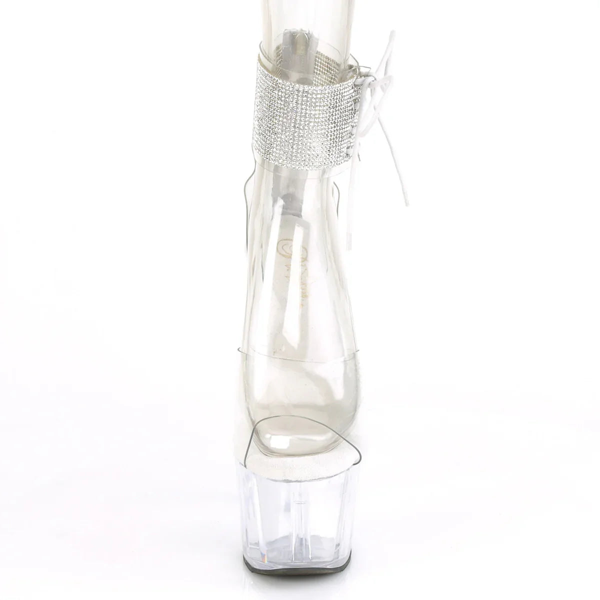 Lightweight, elegant, and with a look that won't go unnoticed. The platform helps distribute the foot's tilt and improves stability while walking. Details that make all the difference: PVC finish, rubber sole, transparent/transparent color. Total height approx. 18 cm with platform: maximum visual impact without sacrificing control.