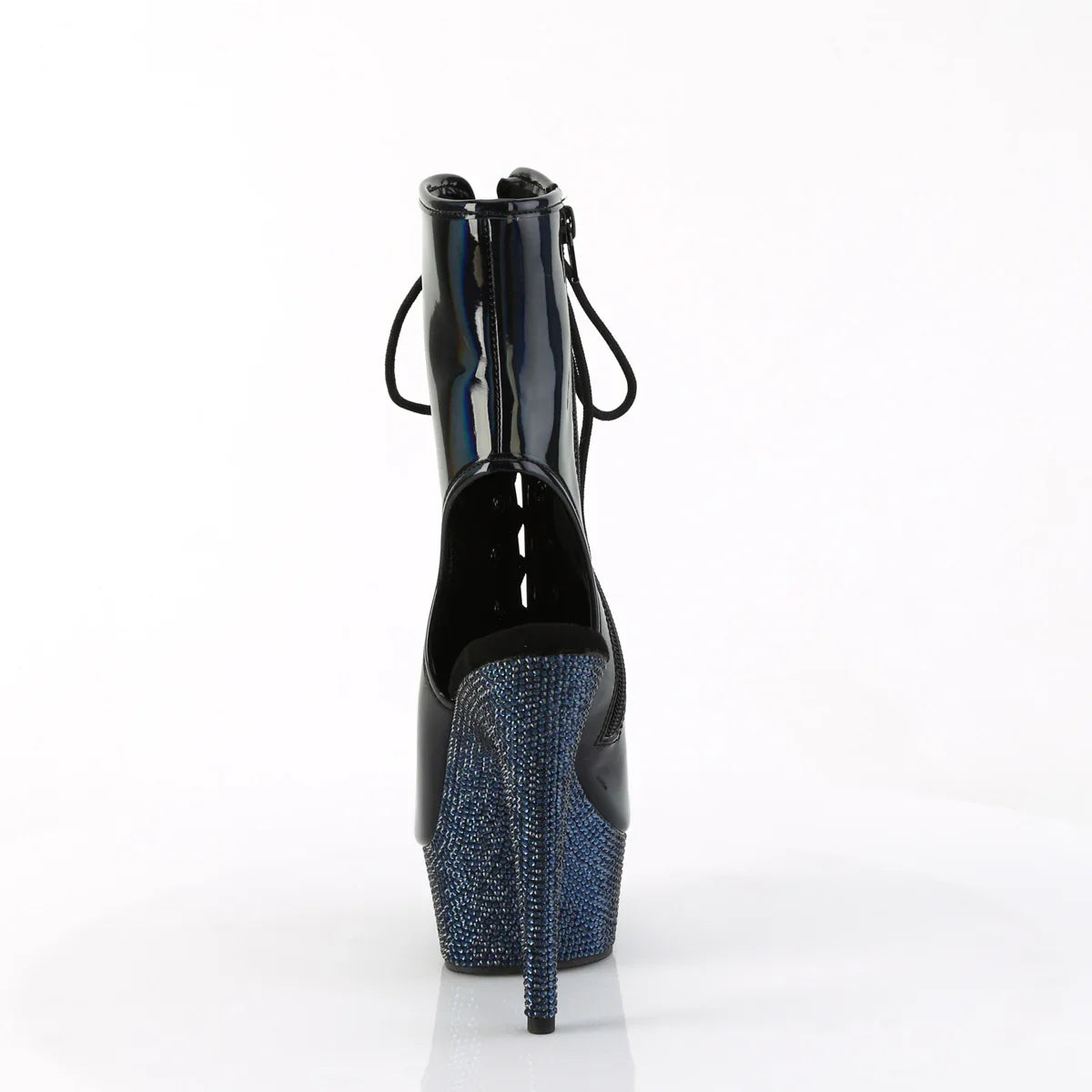 Rhinestone/crystal details for a spectacular look. Total presence: height + shine + powerful silhouette. Key details: high platform, holo black patent leather/midnight black RS, vegan style. Approx. height: 15 cm heel + 4 cm platform. The detail that elevates the look.