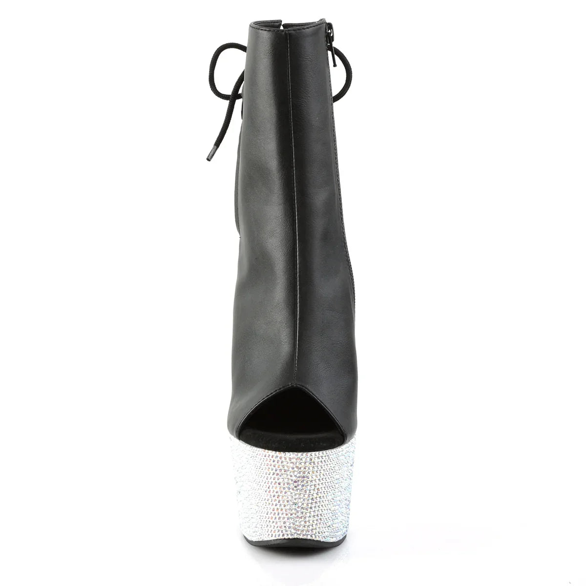 Rhinestone/crystal details for a spectacular look. Total presence: height + sparkle + powerful silhouette. Key details: high platform, PU finish, rubber sole, black faux leather/multicolored silver, vegan style. Approx. height: 18 cm heel + 7 cm platform. Ideal for evening and special events.