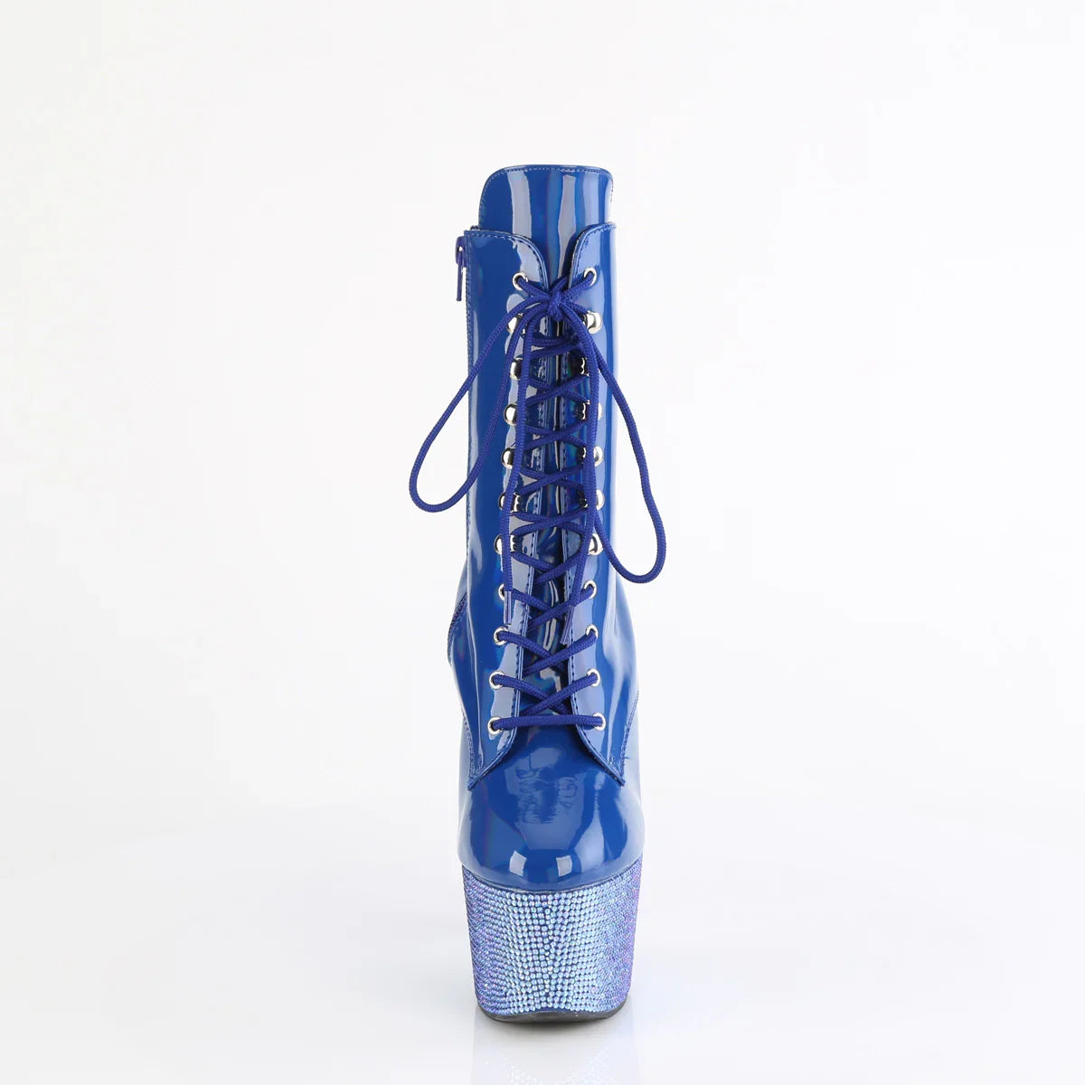 Glamorous design with presence: perfect for special looks. Total presence: height + shine + powerful silhouette. Key details: high platform, PU finish, rubber sole, holo blue patent leather/blue ABS color, vegan style. Approx. height: 18 cm heel + 7 cm platform. Ideal for evening and events.