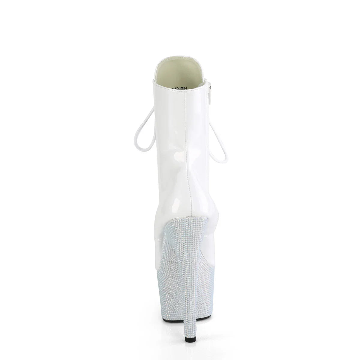 A 'wow' factor the moment the light hits them: pure glamour. A glamorous boot with shimmering details for effortless style. Key features: high platform, PU finish, rubber sole, holo white patent/white RS color, vegan style. Approx. height: 18 cm heel + 7 cm platform. Effortless glamour.