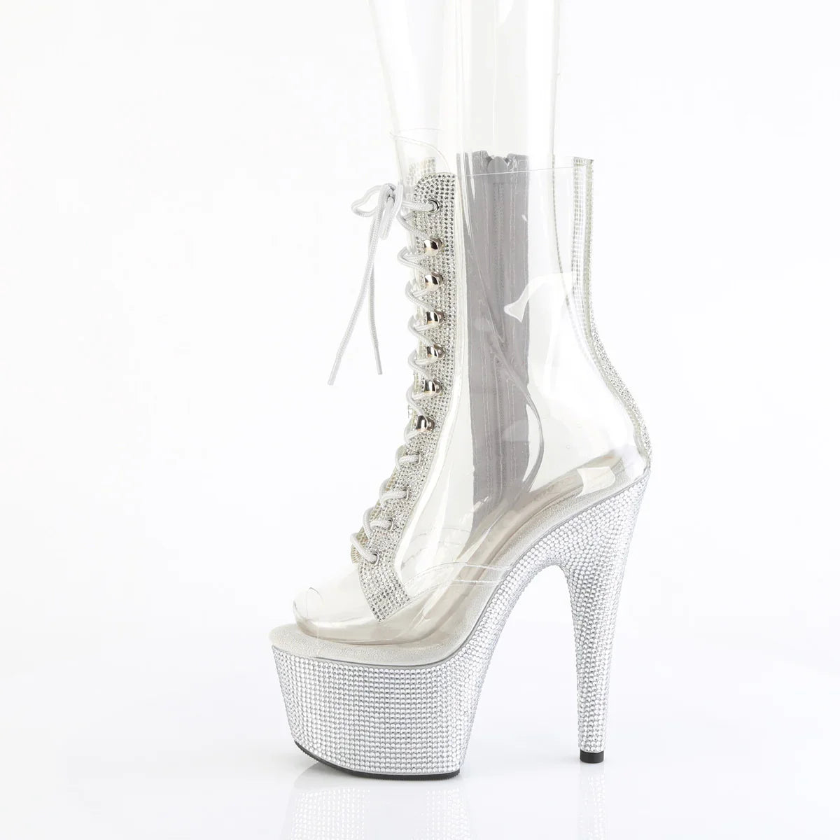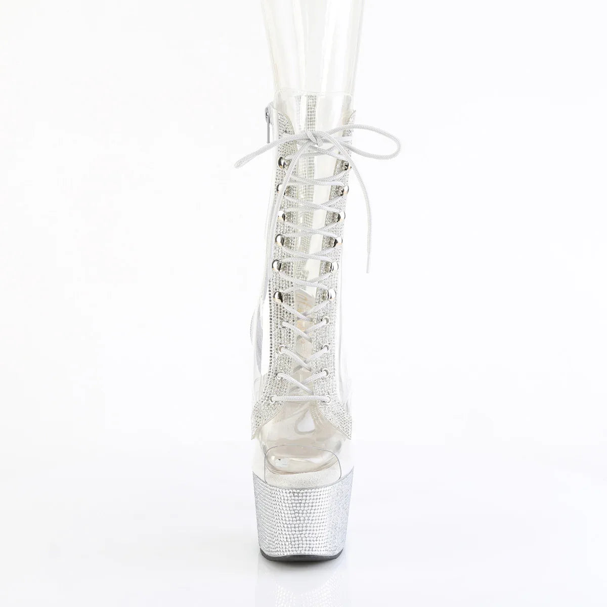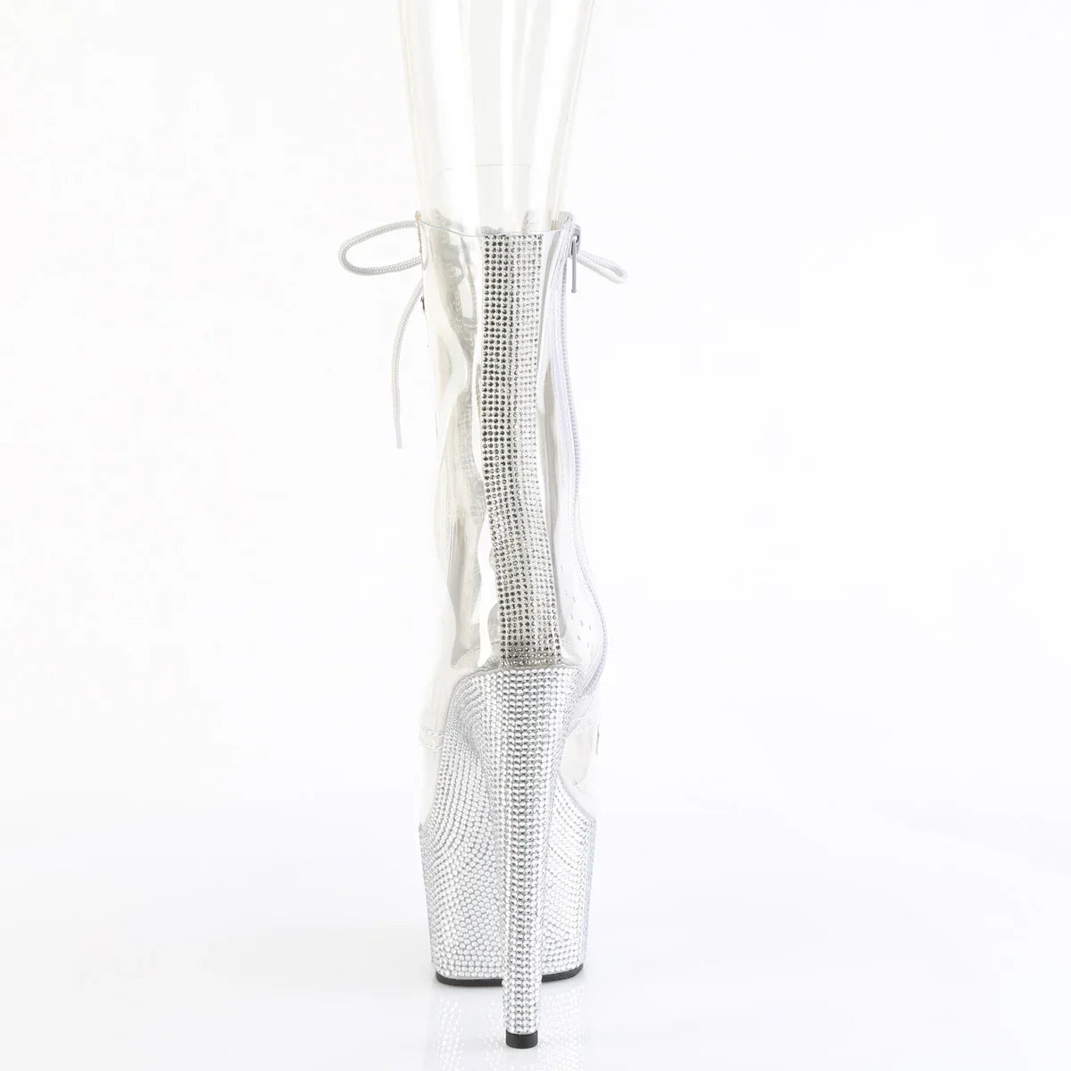 Rhinestone/crystal details for a spectacular look. Platform boot with a striking finish for a statement look. Key details: high platform, PVC finish, rubber sole, transparent - rs / silver rs color, vegan style. Approx. height: 18 cm heel + 7 cm platform. Ideal for evening and special events.