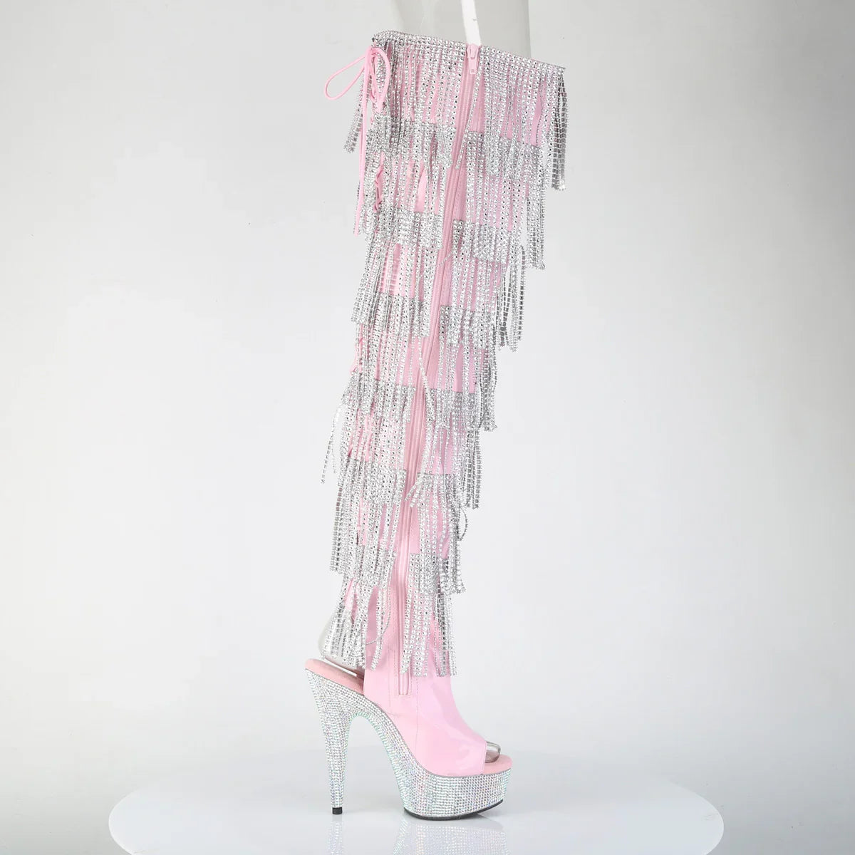 Instant shine: a jewel-like finish that commands attention. Platform boot with a striking finish for a statement look. Key details: high platform, patent leather finish, rubber sole, color: holographic pink patent leather/silver, vegan style. Approx. height: 15cm heel + 4cm platform. Effortless glamour.