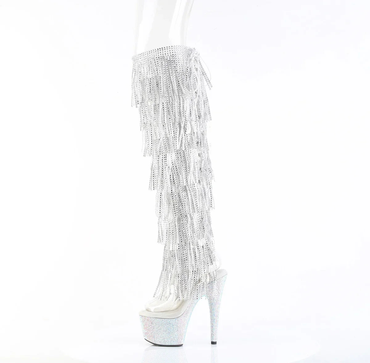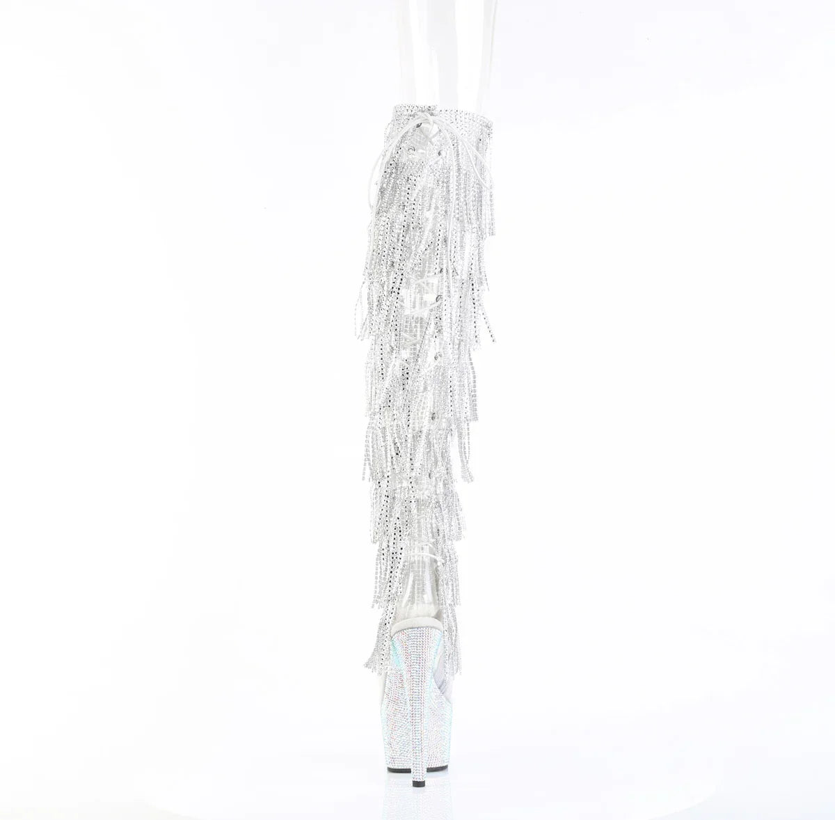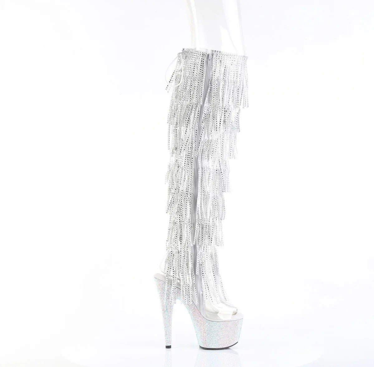 A 'wow' effect as soon as the light hits it: pure glamour. Total presence: height + shine + powerful silhouette. Key details: high platform, TPU finish, rubber sole, transparent/silver color, vegan style. Approx. height: 18 cm heel + 7 cm platform. Ideal for evening and special events.