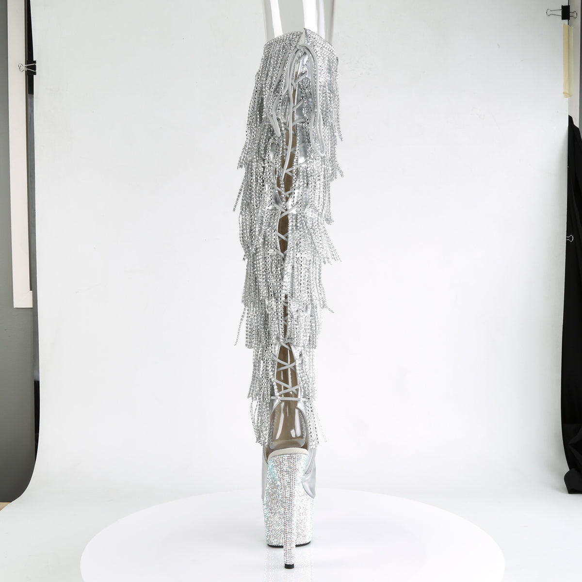 A 'wow' effect as soon as the light hits it: pure glamour. Total presence: height + shine + powerful silhouette. Key details: high platform, PU finish, rubber sole, metallic silver PU - silver/multicolored silver, vegan style. Approx. height: 18 cm heel + 7 cm platform. Ideal for evening and special events.