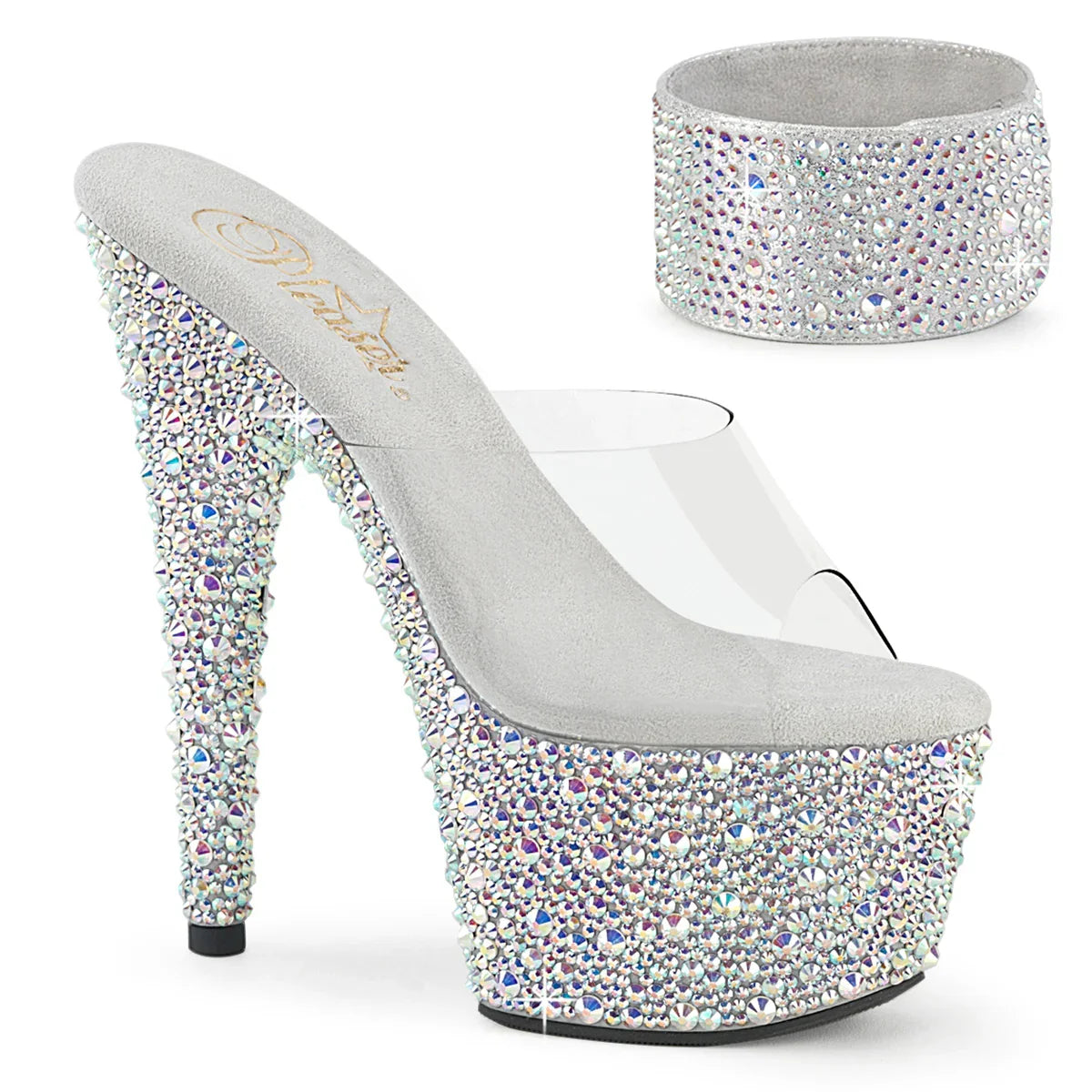 A 'wow' effect as soon as the light hits it: pure glamour. Platform sandal with a jeweled aesthetic, ideal for evenings and special events. Key details: high platform, PVC finish, rubber sole, transparent/silver color, vegan style. Approx. height: 18 cm heel + 7 cm platform. The detail that elevates the look.