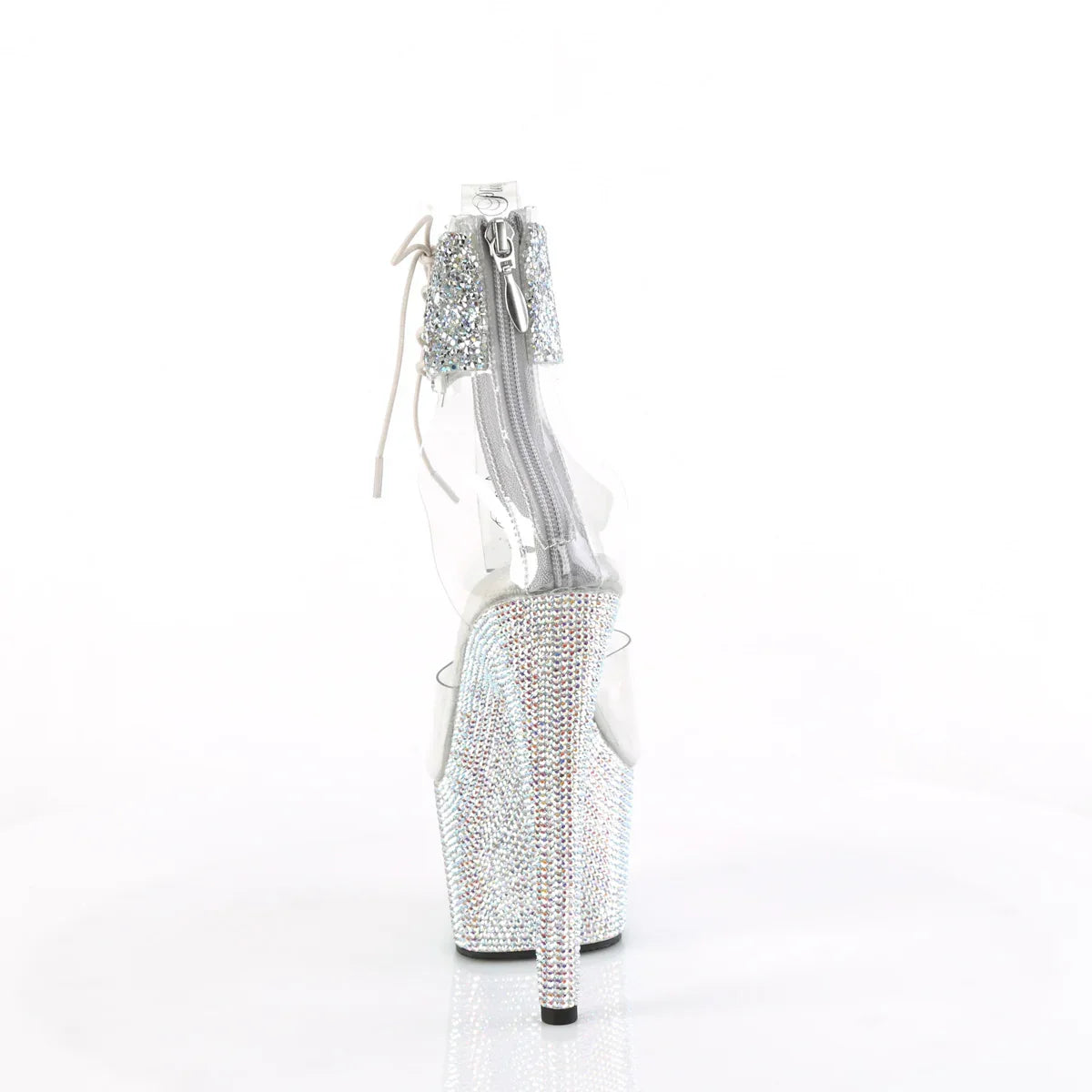 A 'wow' effect as soon as the light hits it: pure glamour. A glam look that instantly elevates any outfit. Key details: high platform, PVC finish, rubber sole, transparent - multicolor silver rs / silver ab rs color, vegan style. Approx. height: 18 cm heel + 7 cm platform. The detail that elevates the look.
