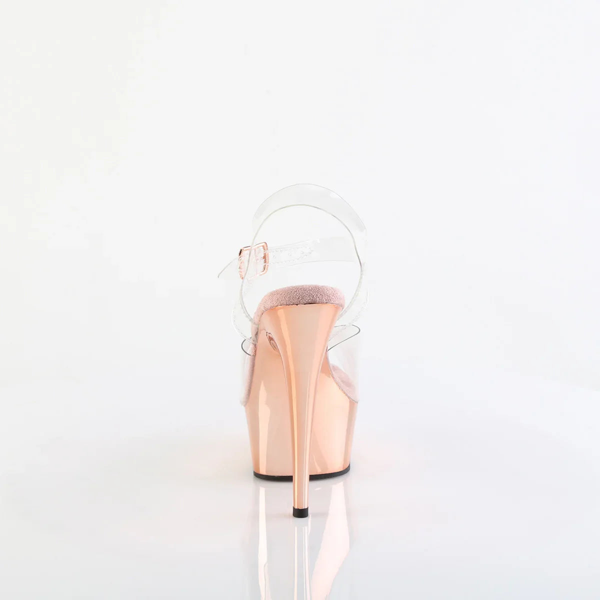 Lightweight, elegant, and with a look that won't go unnoticed. The platform helps distribute the foot's tilt and improves stability while walking. Details that make all the difference: PVC finish, rubber sole, transparent/rose gold chrome color. Total height approx. 15 cm with platform: maximum visual impact without sacrificing control.