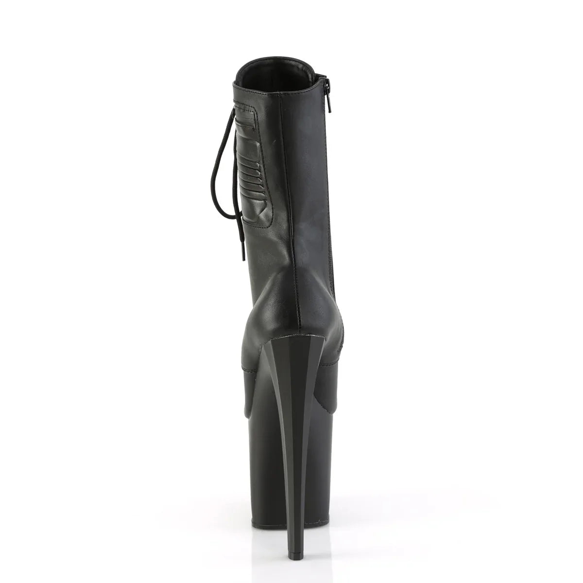 Clean lines and a commanding presence: a style that makes a statement without being over the top. A heeled boot with a polished aesthetic for an elegant statement look. Key details: platform, PU finish, rubber sole, faux leather/matte black, vegan style. Approx. height: 20 cm heel + 10 cm platform. Sophisticated, eye-catching, and with presence.