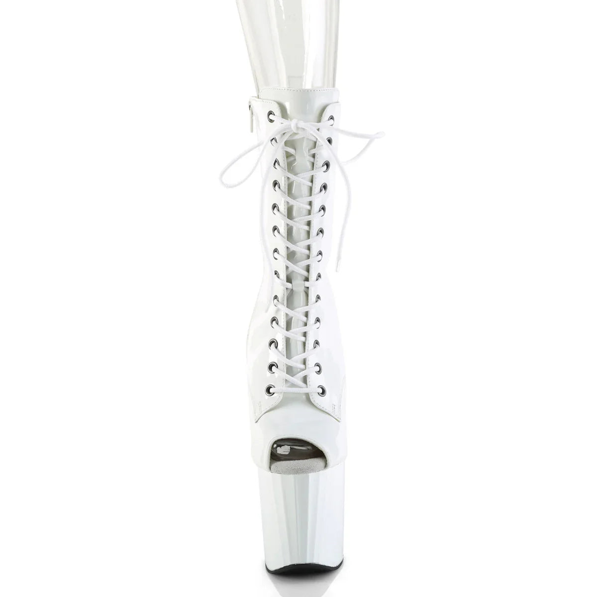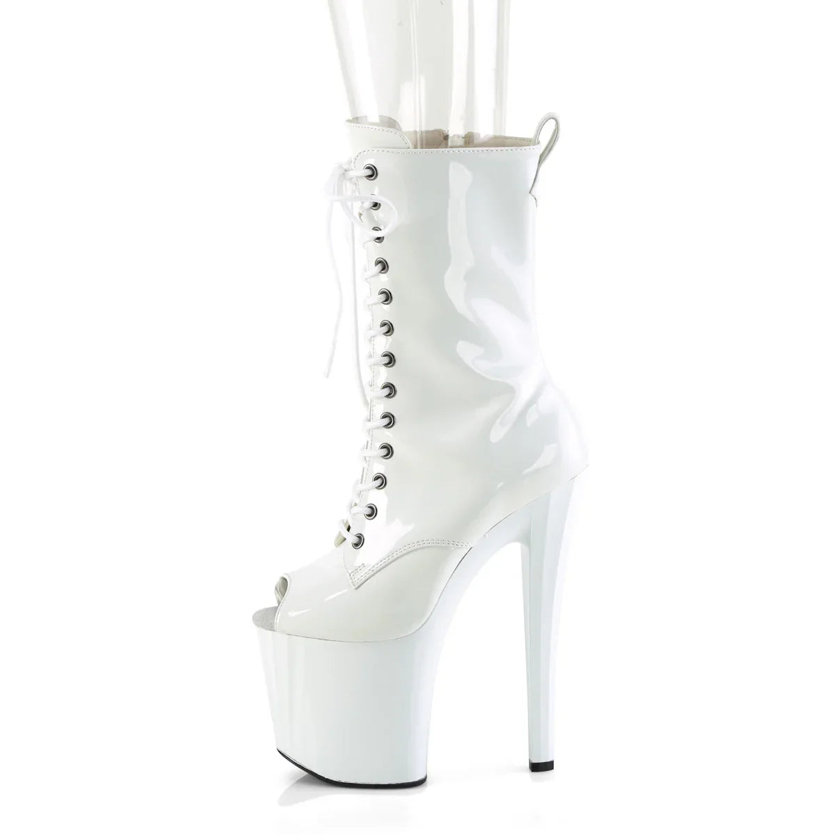 If you're looking for an elegant and eye-catching look, this line is a sure bet. Perfect for event looks, evenings out, and striking combinations. Key details: platform, patent leather finish, rubber sole, white patent leather/white color, vegan style. Approx. height: 20 cm heel + 10 cm platform. For a refined and flattering look.