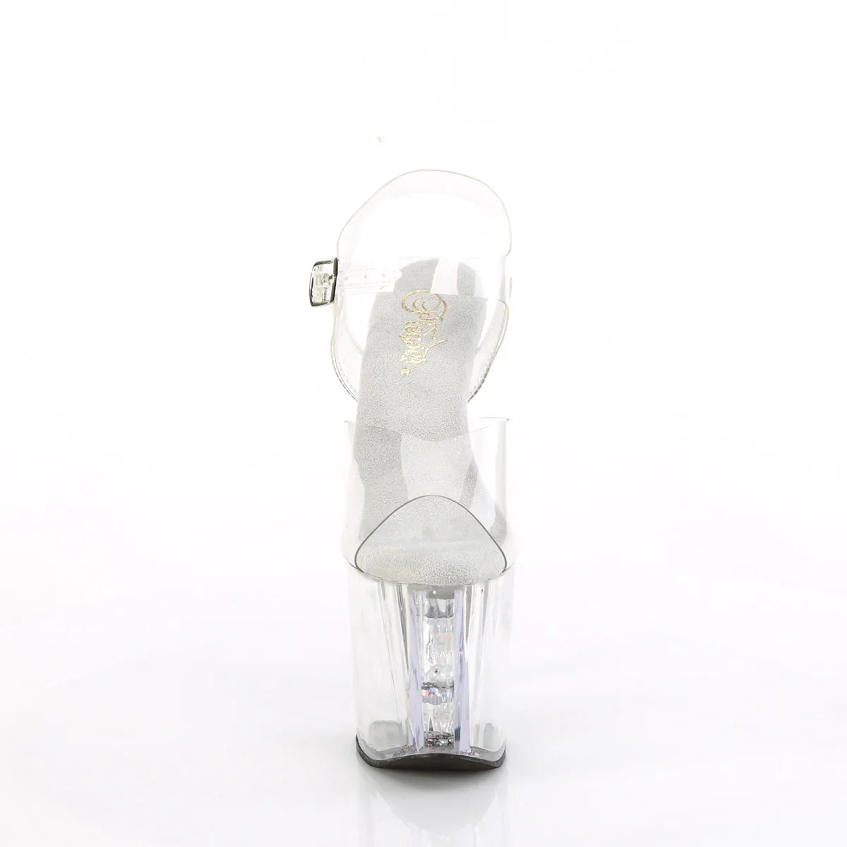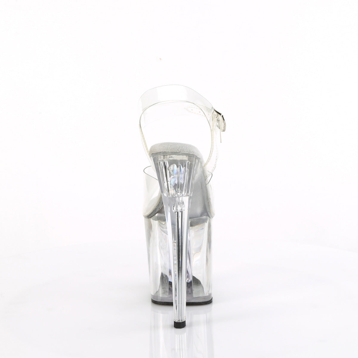 If you're looking for a stylish and eye-catching look, this style is a sure winner. Platform heeled sandals for an elegant and comfortable look. Key details: platform, PVC finish, rubber sole, transparent/transparent-silver color, vegan style. Approx. height: 20 cm heel + 10 cm platform. For a refined and flattering look.
