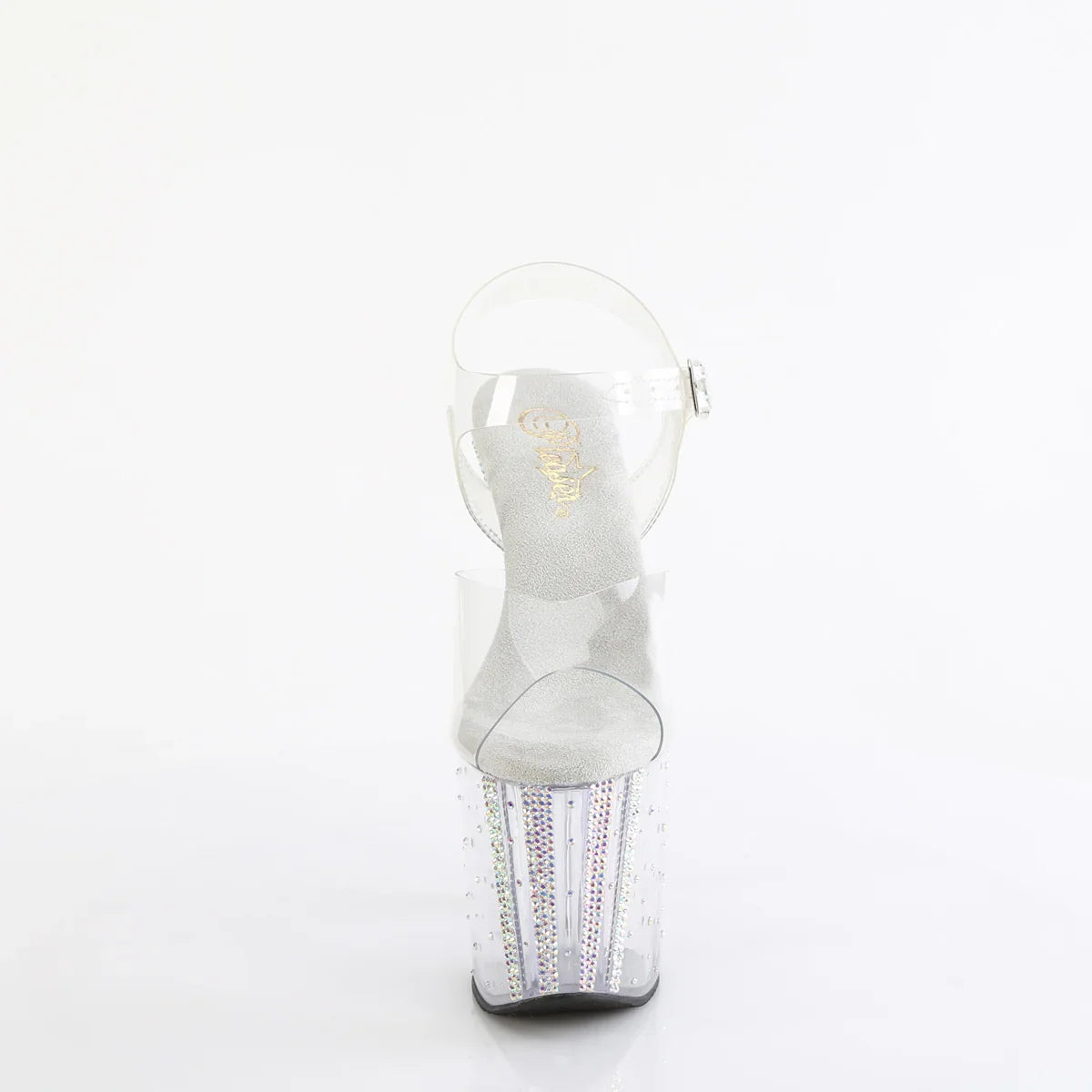 Elegance with a special touch: a design that elevates your look. A sleek design with a flattering finish, perfect for special occasions. Key details: platform, PVC finish, rubber sole, transparent/clear color, vegan style. Approx. height: 20 cm heel + 10 cm platform. Stylish and easy to pair.