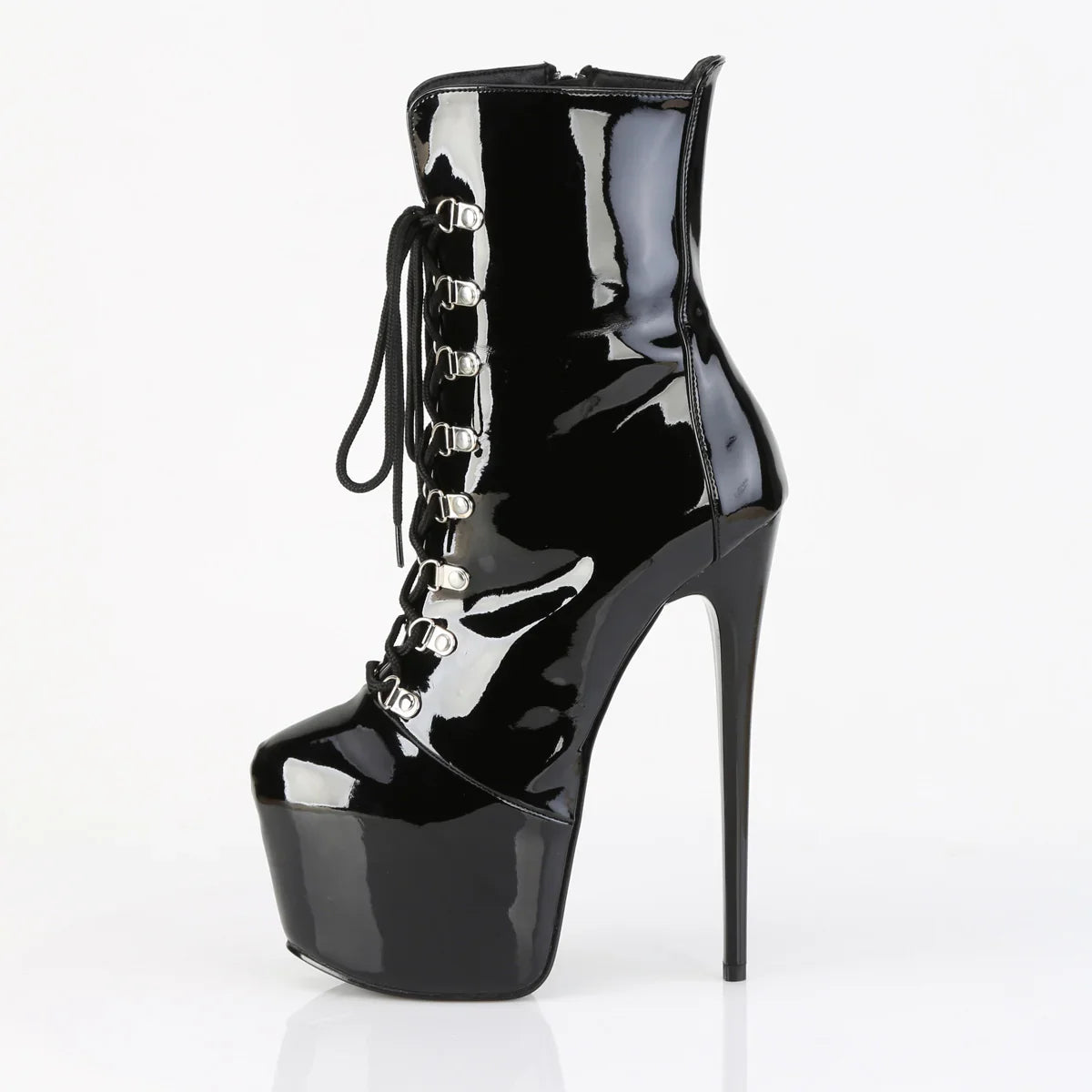 A statement piece from the first glance: a design with personality. Height and style to stand out effortlessly. Key details: platform, patent leather finish, rubber sole, black patent leather, vegan style. Approx. height: 18 cm heel + 8 cm platform. Guaranteed visual impact.