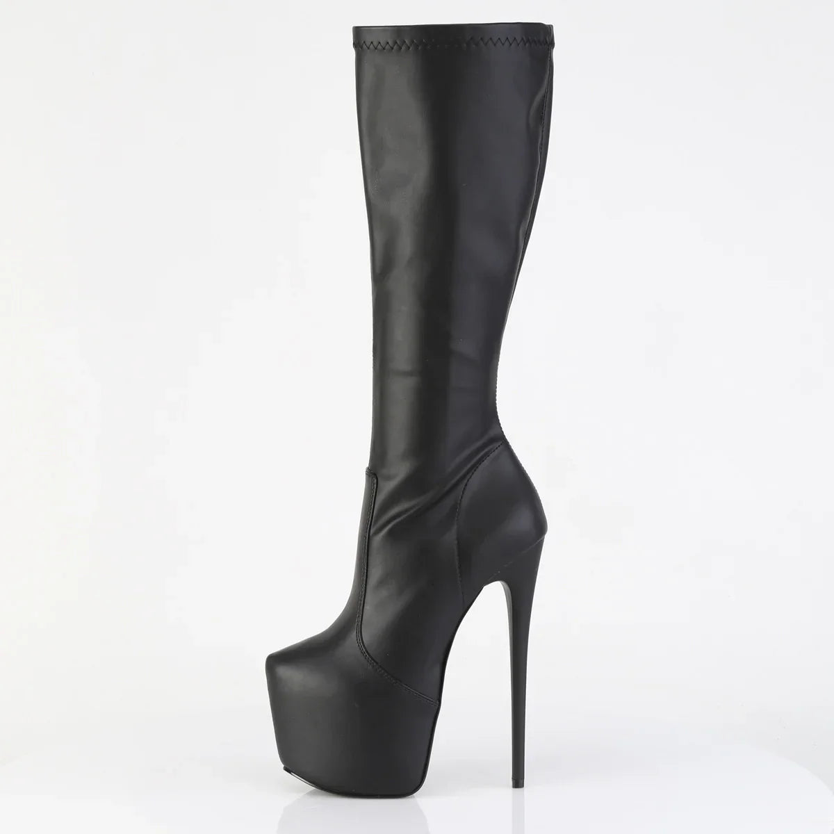 For when you want a bold, fun, and elegant look all at once. A striking boot for powerful outfits and special nights. Key details: platform, patent leather finish, rubber sole, black synthetic leather upper, vegan style. Approx. height: 18 cm heel + 8 cm platform. For stylish nights and events.