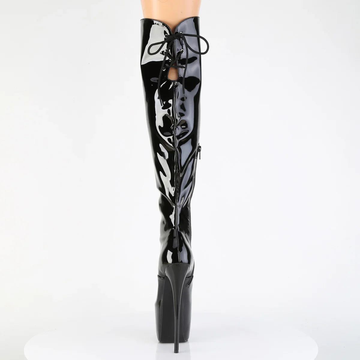 A festive and eye-catching touch: a striking design to stand out. A platform boot with presence: a statement look with character. Key details: platform, patent leather finish, rubber sole, black patent leather, vegan style. Approx. height: 18 cm heel + 8 cm platform. For stylish evenings and events.