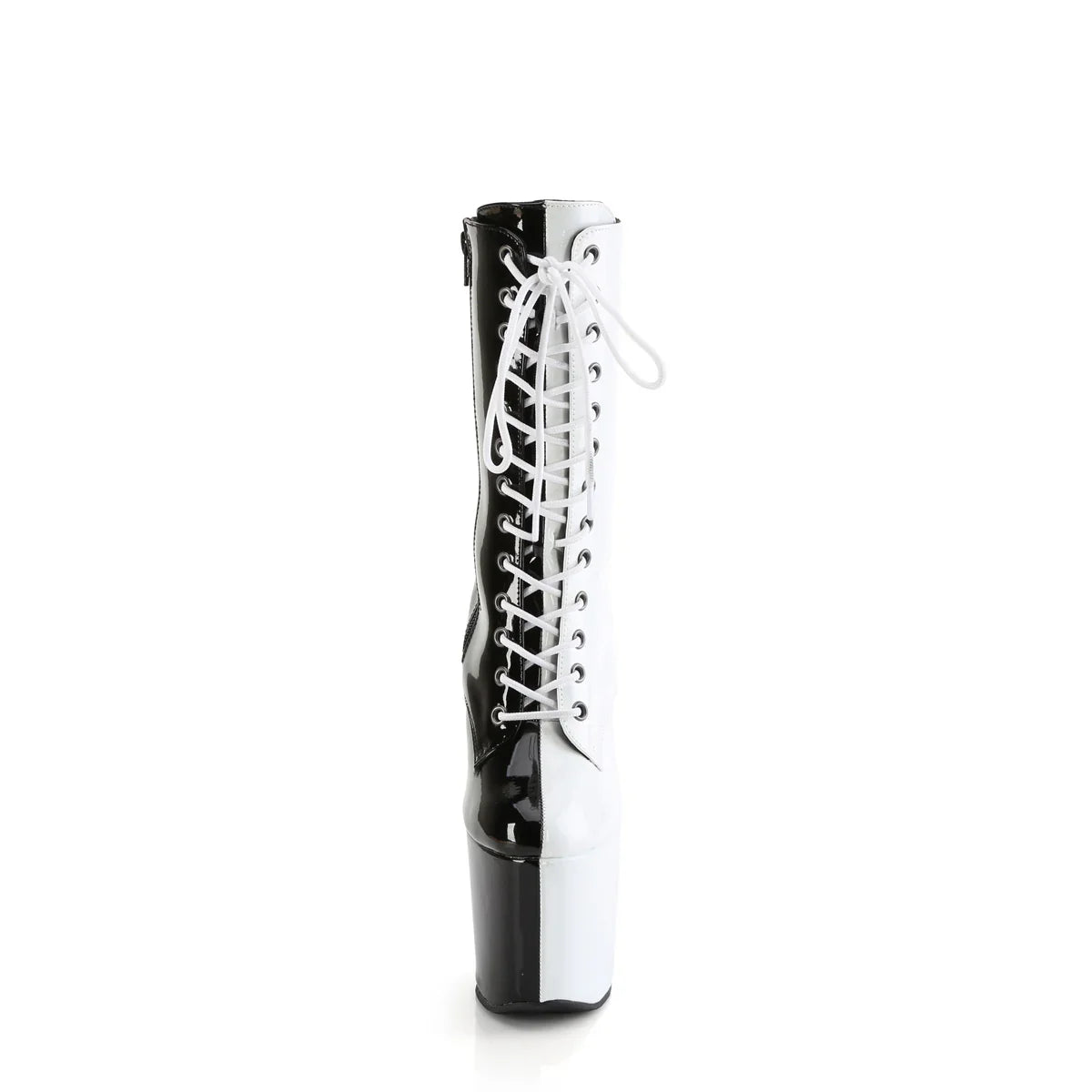 For when you want a bolder, more eye-catching outfit. Platform boots with a statement aesthetic and plenty of presence. Key details: platform, patent leather finish, rubber sole, black and white patent leather/black and white color scheme, vegan style. Approx. height: 20 cm heel + 8 cm platform. A modern and powerful look.