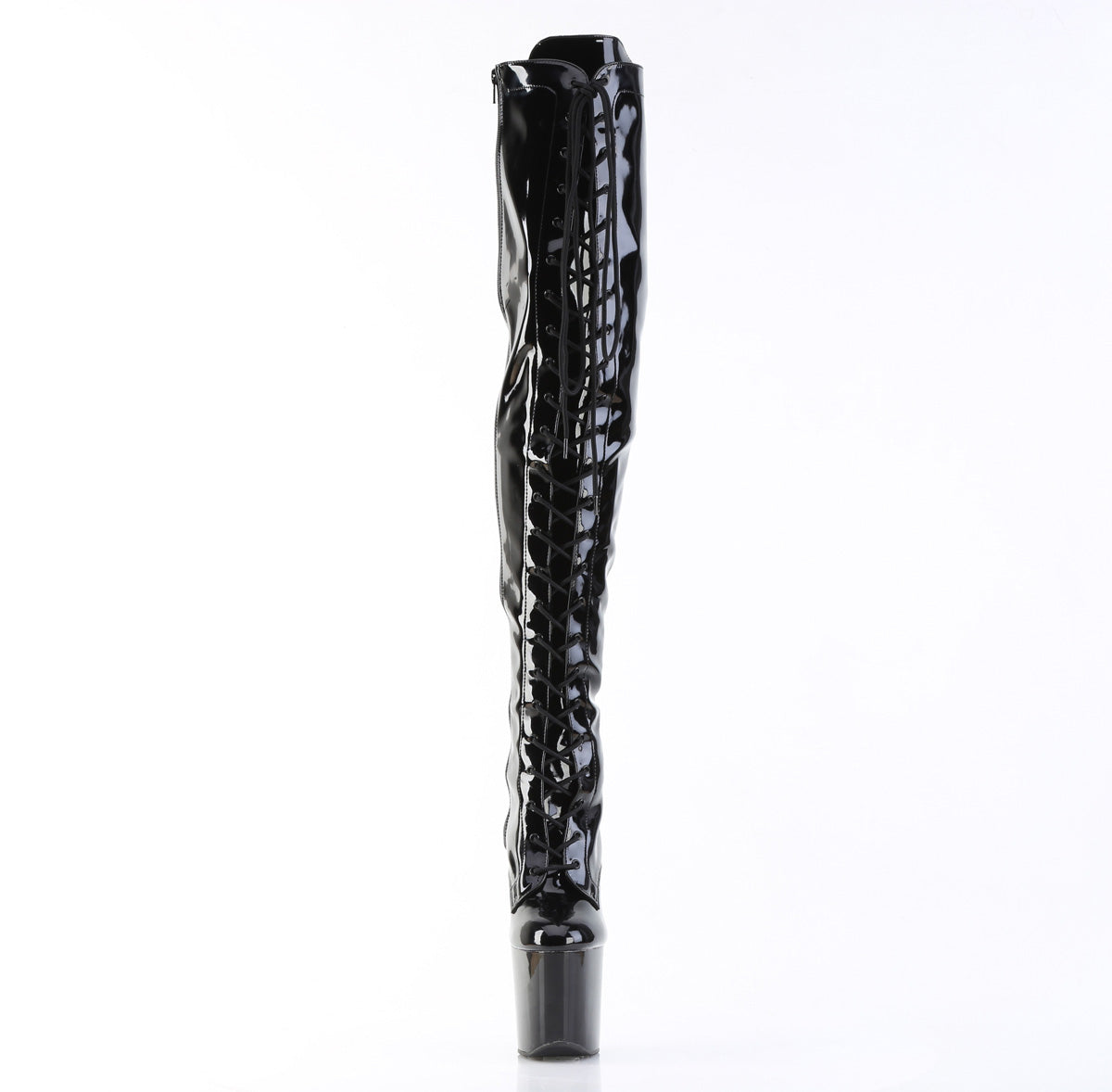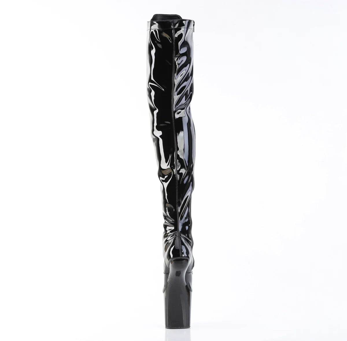 A modern look that commands attention at first glance. Height and style for effortless style. Key details: platform, patent leather finish, rubber sole, black patent leather/black color, vegan style. Approx. height: 20 cm heel + 8 cm platform. For truly standing out.