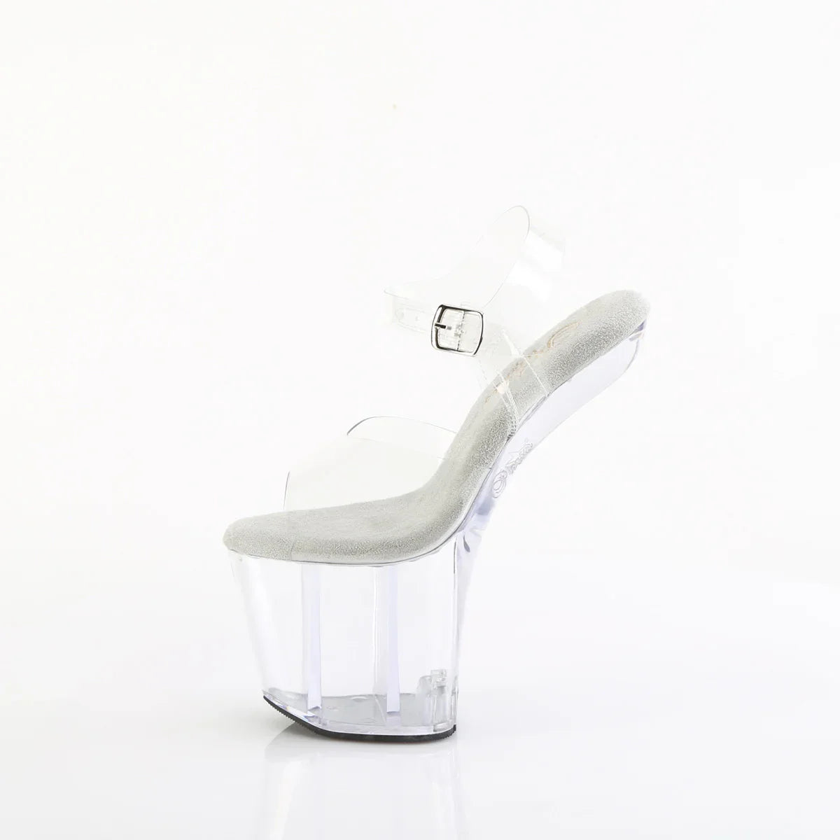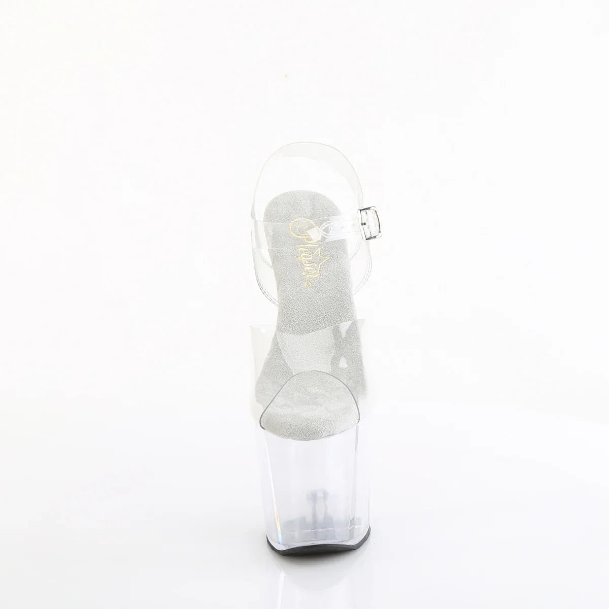 A modern look that makes a statement at first glance. Platform sandals with a powerful and contemporary style. Key details: platform, PVC finish, rubber sole, transparent/clear color, vegan style. Approx. height: 20 cm heel + 8 cm platform. Truly stand out.
