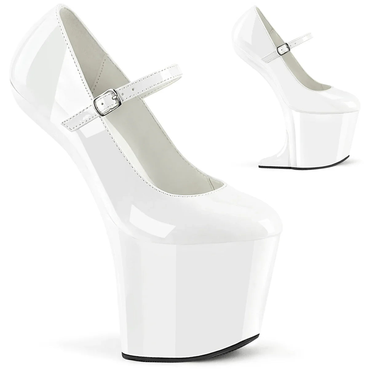 Visual impact and effortless style. A modern design with details that elevate any outfit. Key features: platform, patent leather finish, rubber sole, white patent leather/white color, vegan style. Approx. height: 20 cm heel + 8 cm platform. Visually stunning in photos and in person.
