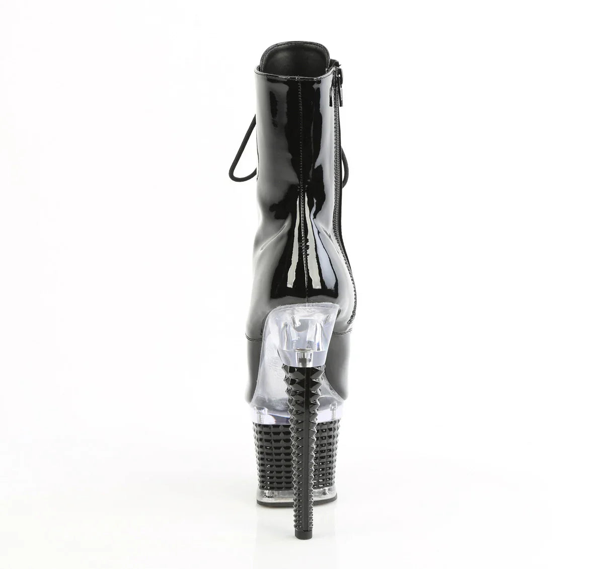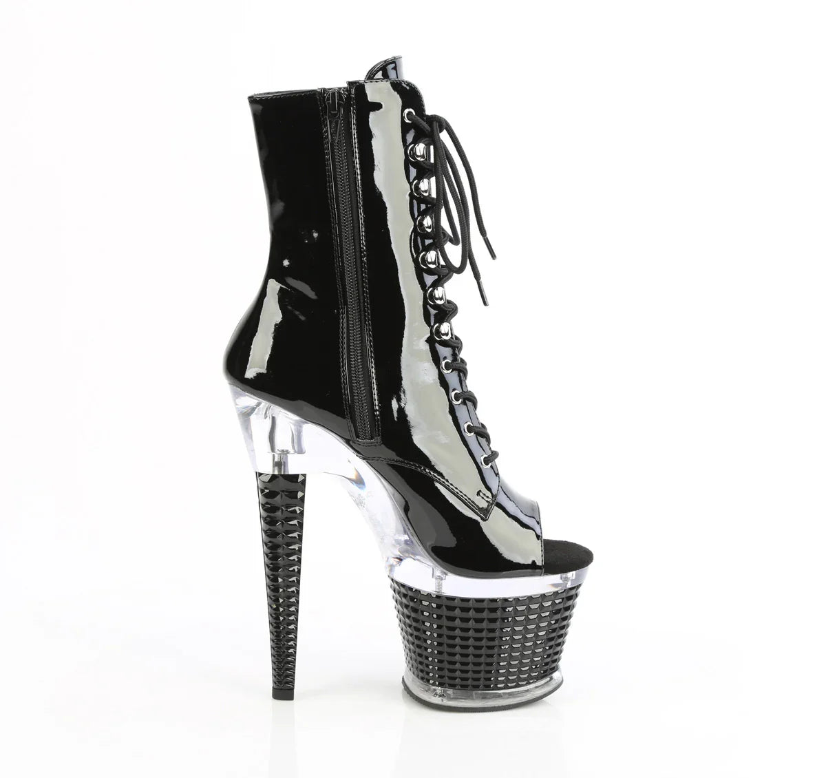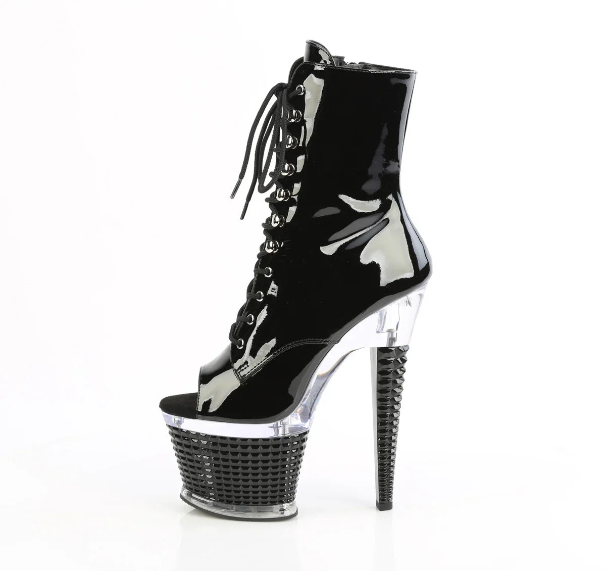 Simple, flattering, and a real showstopper. A striking yet elegant look for evening events. Key details: platform, patent leather finish, rubber sole, black patent/transparent black color scheme, vegan style. Approx. height: 18 cm heel + 8 cm platform. Sleek and flattering.
