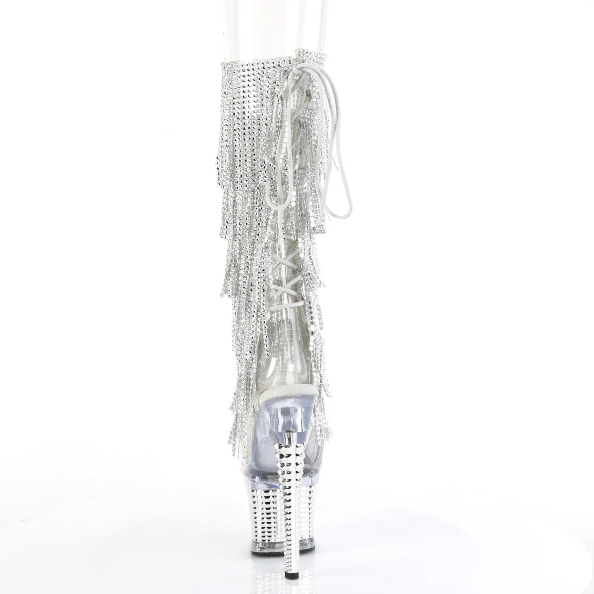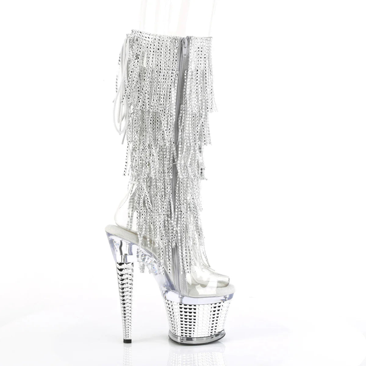A polished look that effortlessly elevates any outfit. A striking yet elegant look for evenings and special occasions. Key details: platform, PVC finish, rubber sole, transparent-silver/transparent-chrome silver colorway, vegan style. Approx. height: 18 cm heel + 8 cm platform. Easy to style.