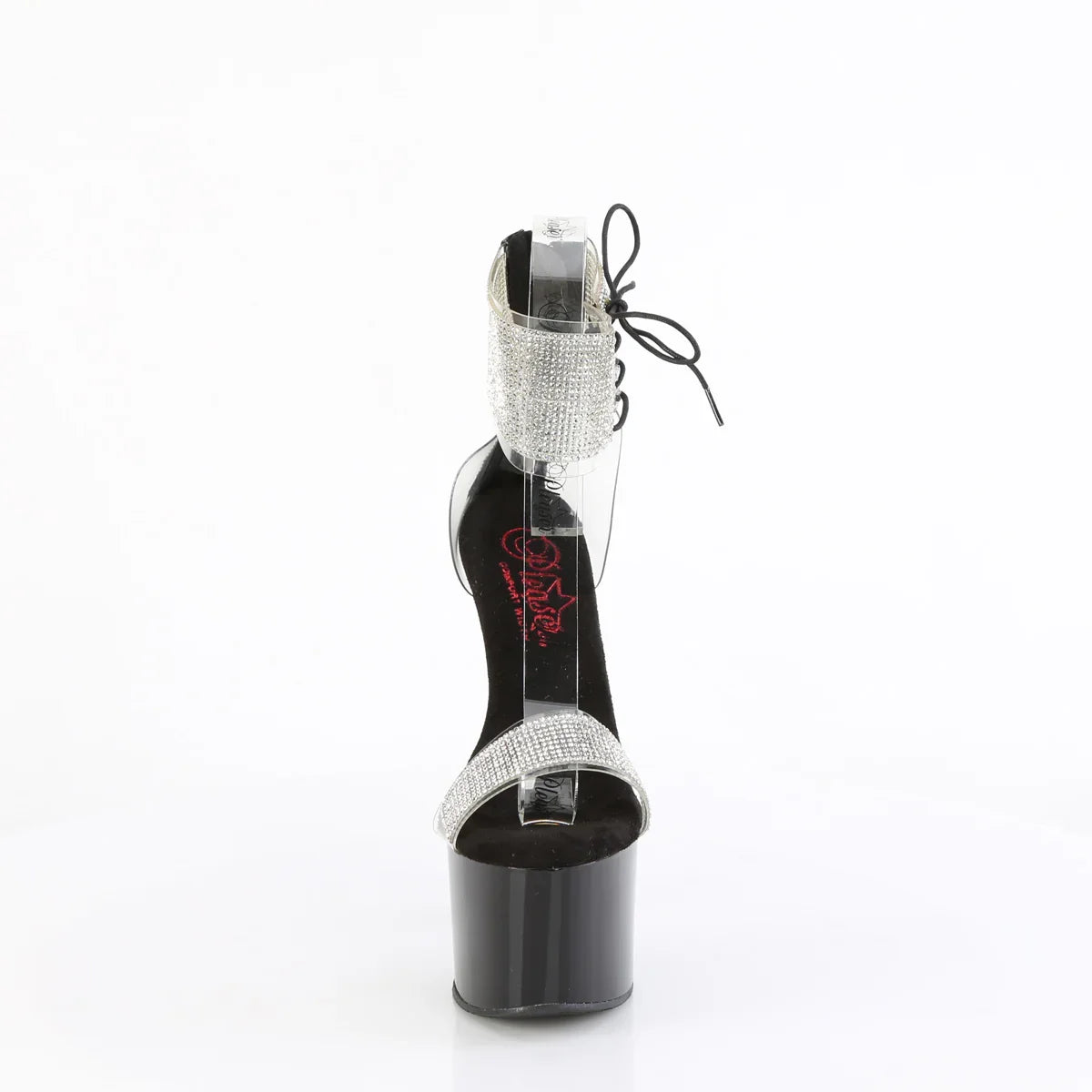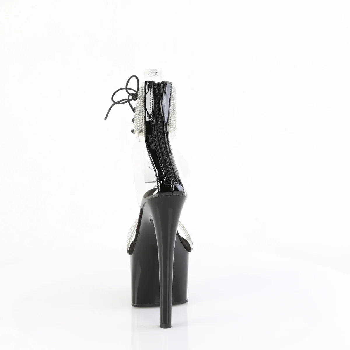 A striking design that instantly elevates any look. Platform sandals with a sleek silhouette that's incredibly versatile. Key details: platform, PVC finish, rubber sole, transparent-black/black colorway, vegan style. Approx. height: 18 cm heel + 7 cm platform. A top choice for events and evenings out.