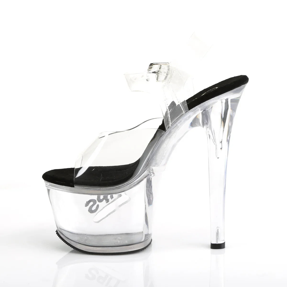If you're looking for a premium finish, this model is perfect. A high platform creates a more striking and flattering effect. Key details: platform, PVC finish, rubber sole, transparent - black/transparent color, vegan style. Approx. height: 18 cm heel + 7 cm platform. Guaranteed to make a statement.