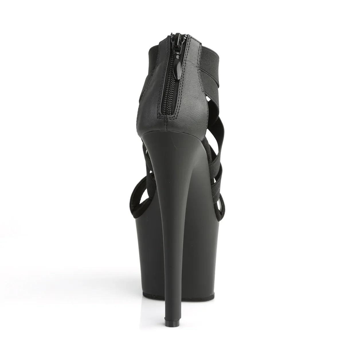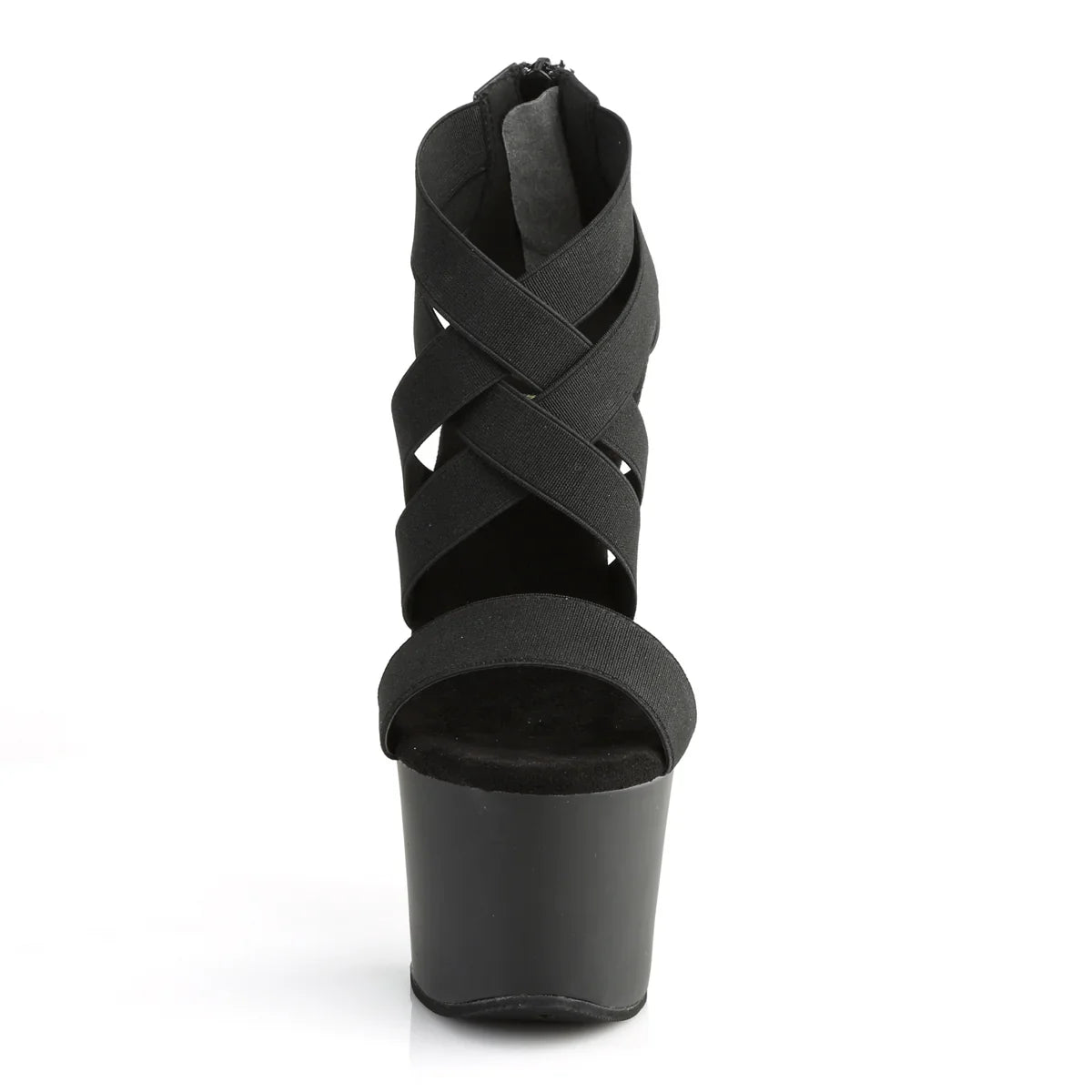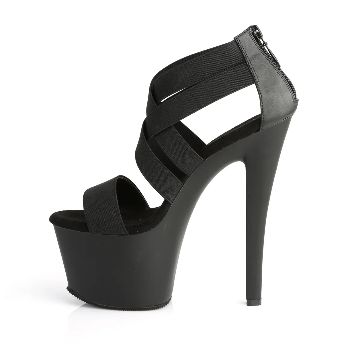 Lightweight, elegant, and with a look that won't go unnoticed. The platform helps distribute the foot's weight and improves stability while walking. Details that make all the difference: elastic finish, rubber sole, black elastic band/matte black color. Total height approx. 18 cm with platform: maximum visual impact without sacrificing control.