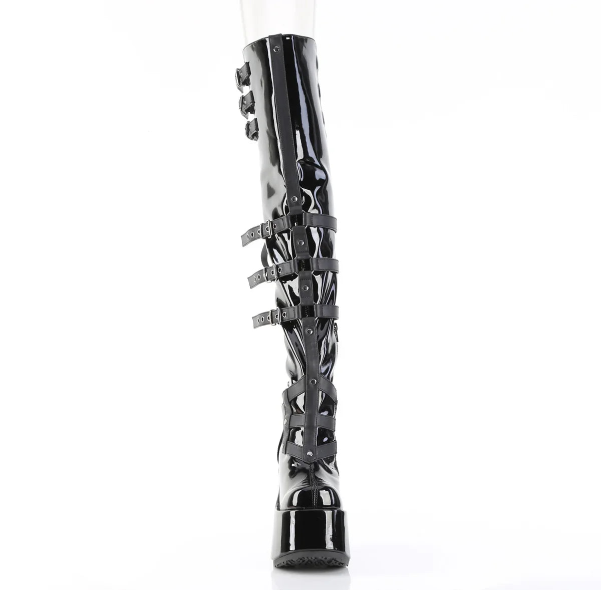A peça confere altura e personalidade com uma silhueta marcante e uma estética alternativa.