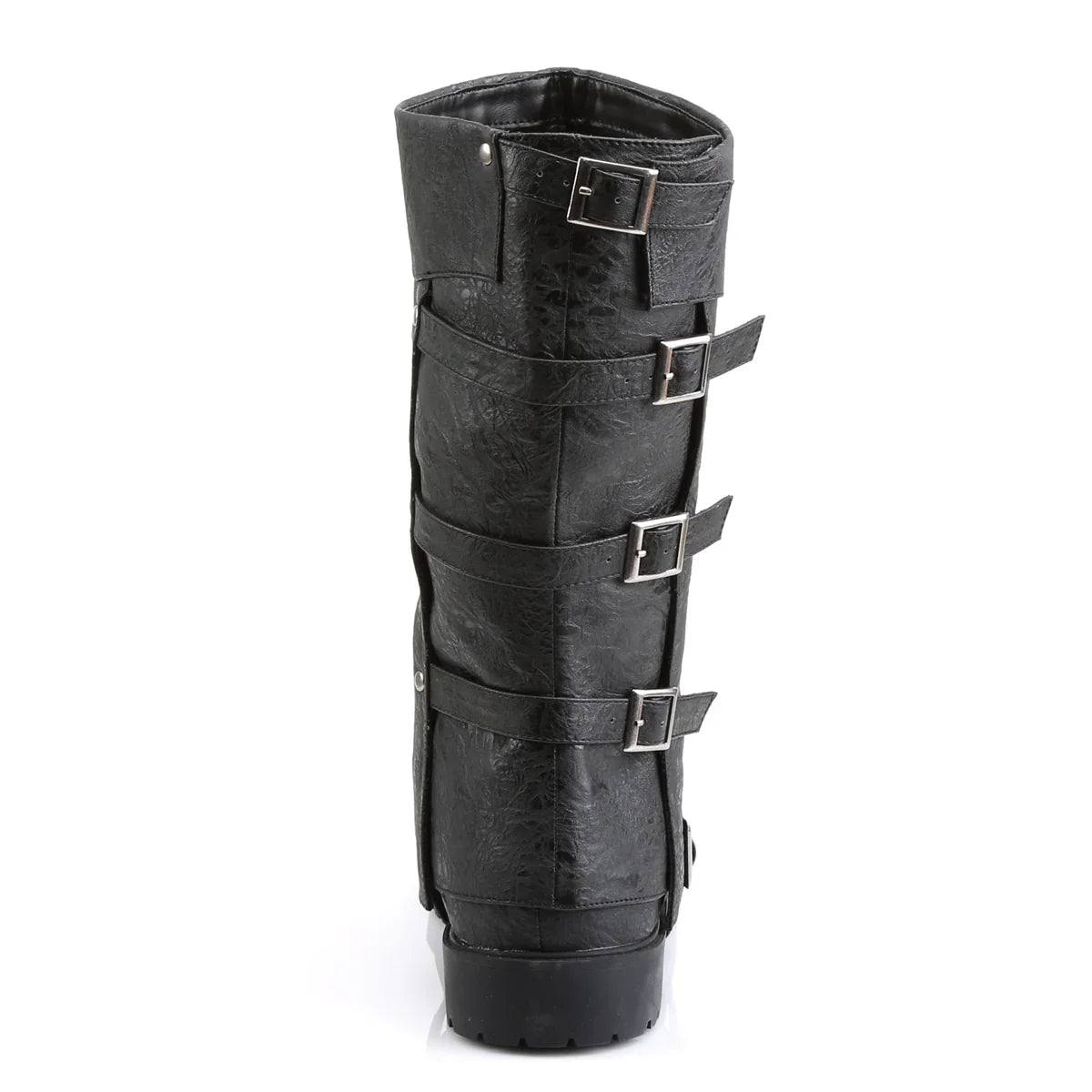 Uma bota marcante que chama a atenção. Perfeita para looks temáticos e atuações em palco. Detalhes principais: acabamento em PU, sola em borracha, PU preto com efeito desgastado, modelo vegan. Altura aproximada do salto: 4 cm. O detalhe que faz toda a diferença.