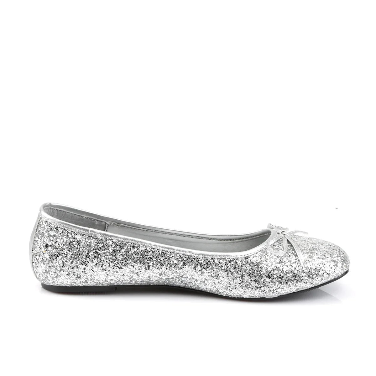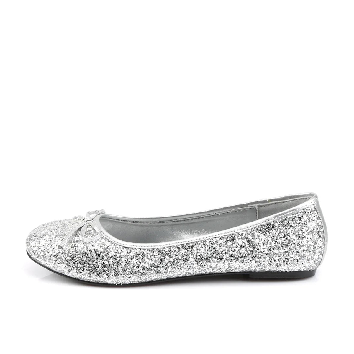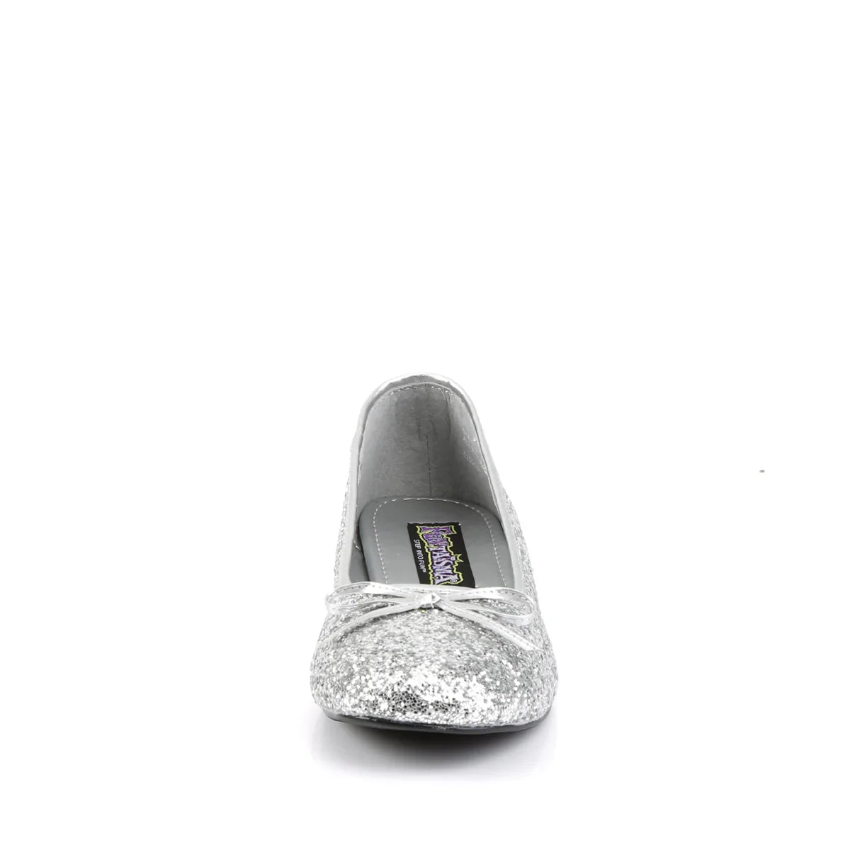 Um sapato temático e visualmente impactante para elevar o seu look. Design atraente com acabamento premium. Detalhes principais: acabamento com glitter, sola em PVC, cor prata com glitter, modelo vegan. Altura aproximada do salto: 0 cm. Perfeito para eventos e sessões fotográficas.